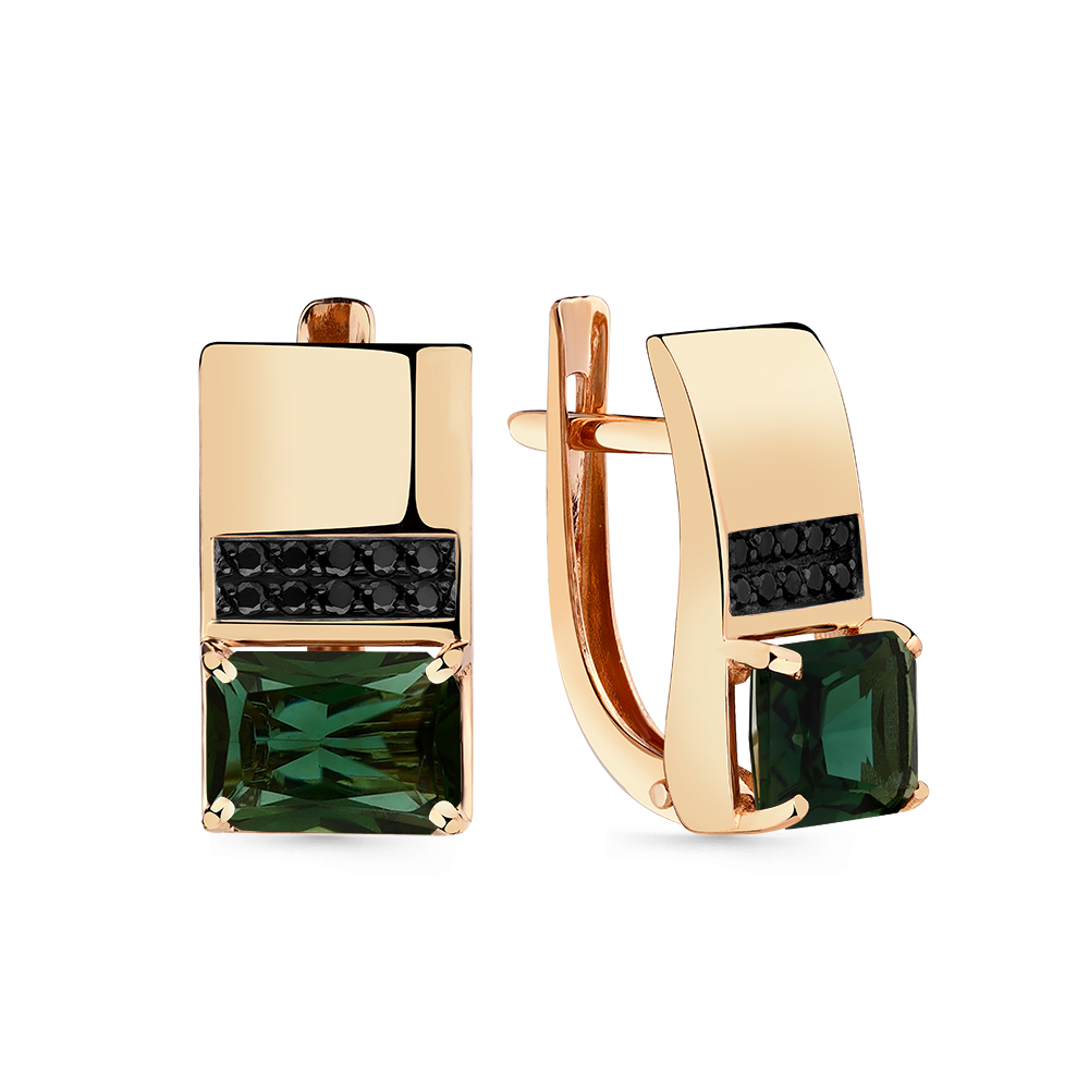 Стильные серьги из красного золота 585 пробы с выразительными вставками с синтетическими турмалинами и черными фианитами станут элегантным дополнением современного образа. Насыщенный блеск камней в оправе из благородного золота привлекает внимание, и сделает женский образ более ярким и притягательным. Приобретайте ювелирное украшение по выгодной цене в магазинах Мир Золота.