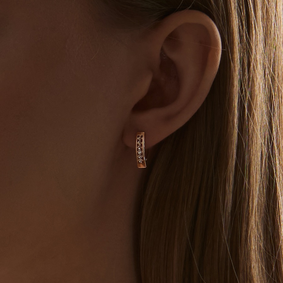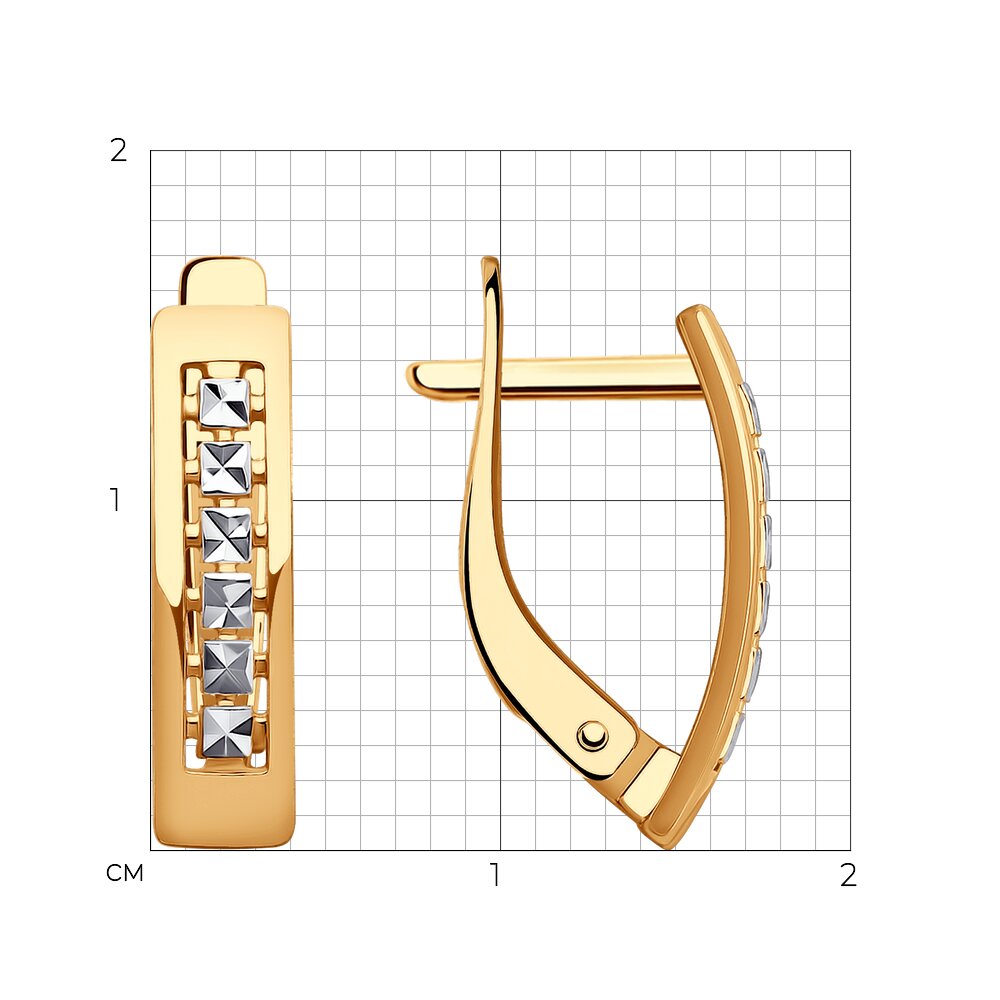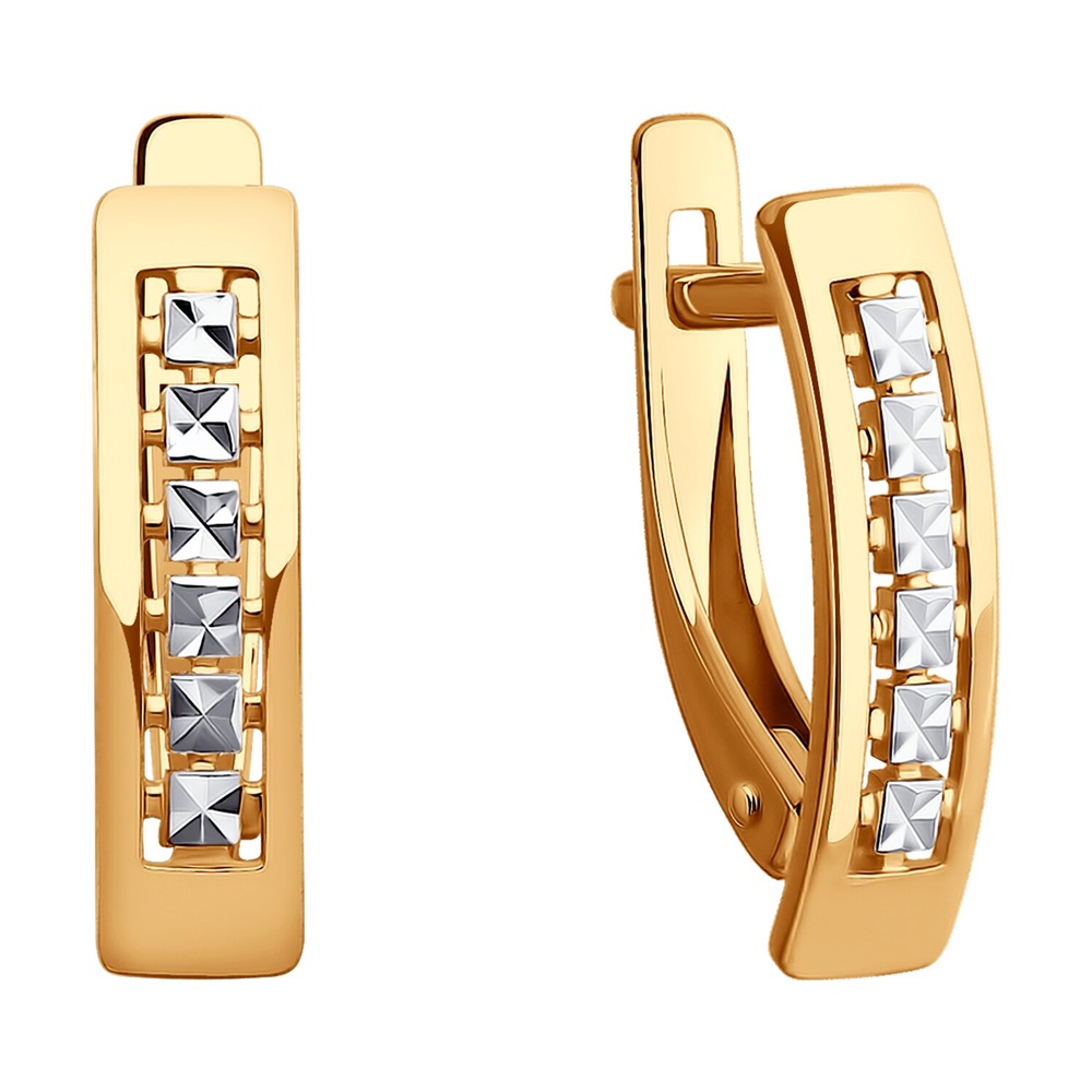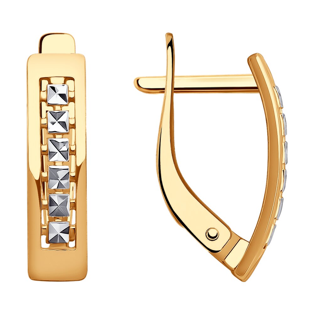 Серьги без дополнительных вставок с алмазной обработкой выполнены из красного и белого золота 585 пробы. Легкие аккуратные серьги с английским замком привлекательно смотрятся, и комфортны в повседневной носке, универсальный дизайн будет уместен для любого образа и стиля. Приобретайте ювелирное украшение по выгодным ценам в магазинах Мир Золота.