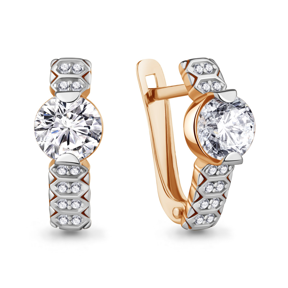 Серьги из красного и белого золота 585 пробы, декорированные сияющими фианитами, заметно преобразят привычный женский образ. Благородный блеск белого золота выгодно подчеркивает кристальное сияние ювелирных камней. Серьги с английским замком комфортны в повседневной носке, и отлично впишутся в современный стиль. Приобретайте украшение в подарок по выгодным ценам в магазинах Мир Золота.