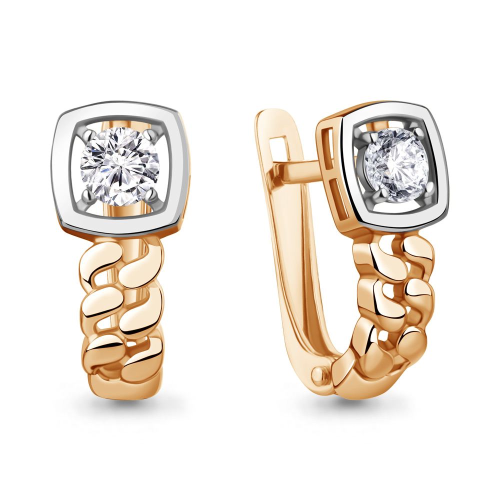 Стильные серьги из красного и белого золота 585 пробы с сияющими фианитами выполнены в современном ювелирном дизайне. Вставки из белого золота выгодно подчеркивают кристальный блеск прозрачных камней. Актуальное украшение станет прекрасным подарком и изысканным акцентом повседневного образа. Приобретайте серьги с английским замком по выгодной цене в магазинах Мир Золота.