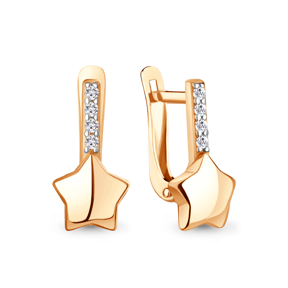 Детские серьги из красного золота 585 пробы с дорожками сияющих фианитов будут идеальным украшением на каждый день. Прекрасные сережки с золотыми звездочками и кристальным блеском камней отлично смотрятся на детском ушке. Порадуйте своих маленьких модниц чудесным подарком, покупайте серьги по выгодным ценам в магазинах Мир Золота.