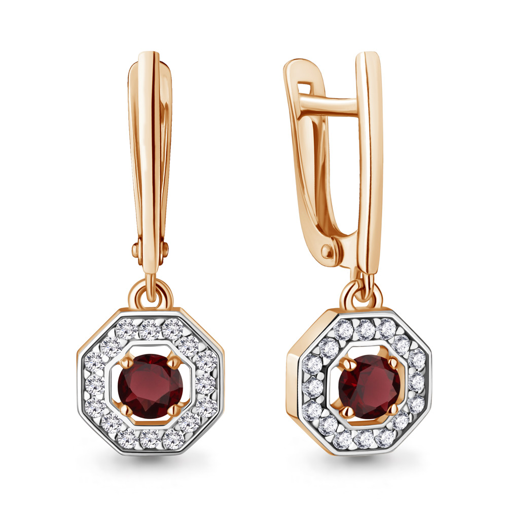 Серьги из красного золота 585 пробы с подвесками с натуральными гранатами и сияющими фианитами подчеркнут женственность и элегантность владелицы. Украшение с насыщенным блеском гранатов в обрамлении кристальных фианитов станет привлекательным акцентом современного образа. Приобретайте серьги в подарок по выгодной цене в магазинах Мир Золота.