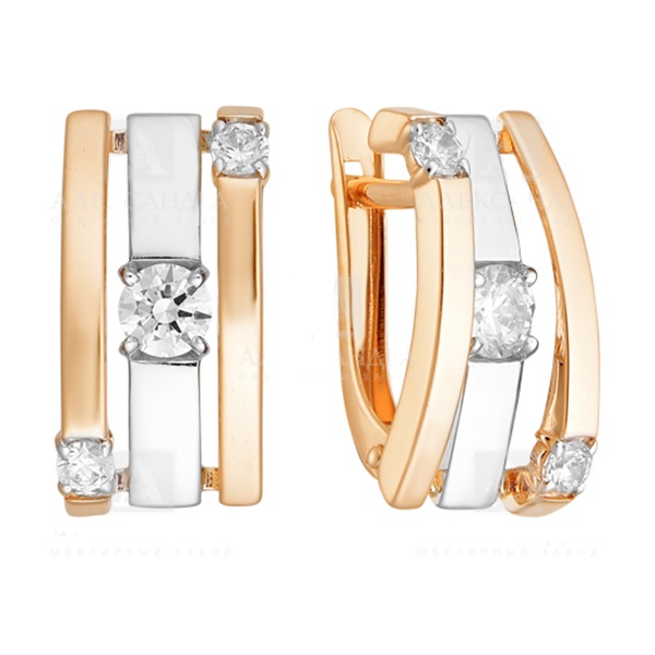 Серьги из красного и белого золота 585 пробы с прозрачными фианитами выполнены в актуальном ювелирном дизайне. Объемное украшение с эффектным дуэтом двух оттенков золота смотрится стильно и современно, и отлично дополнит модные образы своей обладательницы. Приобретайте серьги с английским замком по привлекательной цене в магазинах Мир Золота.