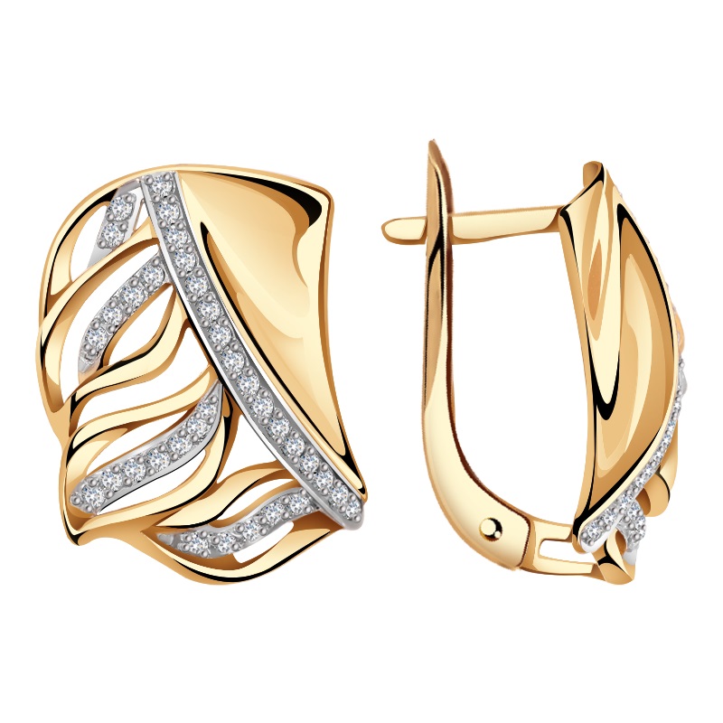 Эффектные серьги современного ювелирного исполнения из красного золота 585 пробы, декорированные дорожками прозрачных фианитов, понравятся поклонницам крупных ювелирных украшений. Серьги объемного дизайна с кристальным блеском камней не останутся незамеченными, и подчеркнут индивидуальность и изысканный вкус обладательницы. Покупайте серьги в подарок по выгодной цене в магазинах Мир Золота.
