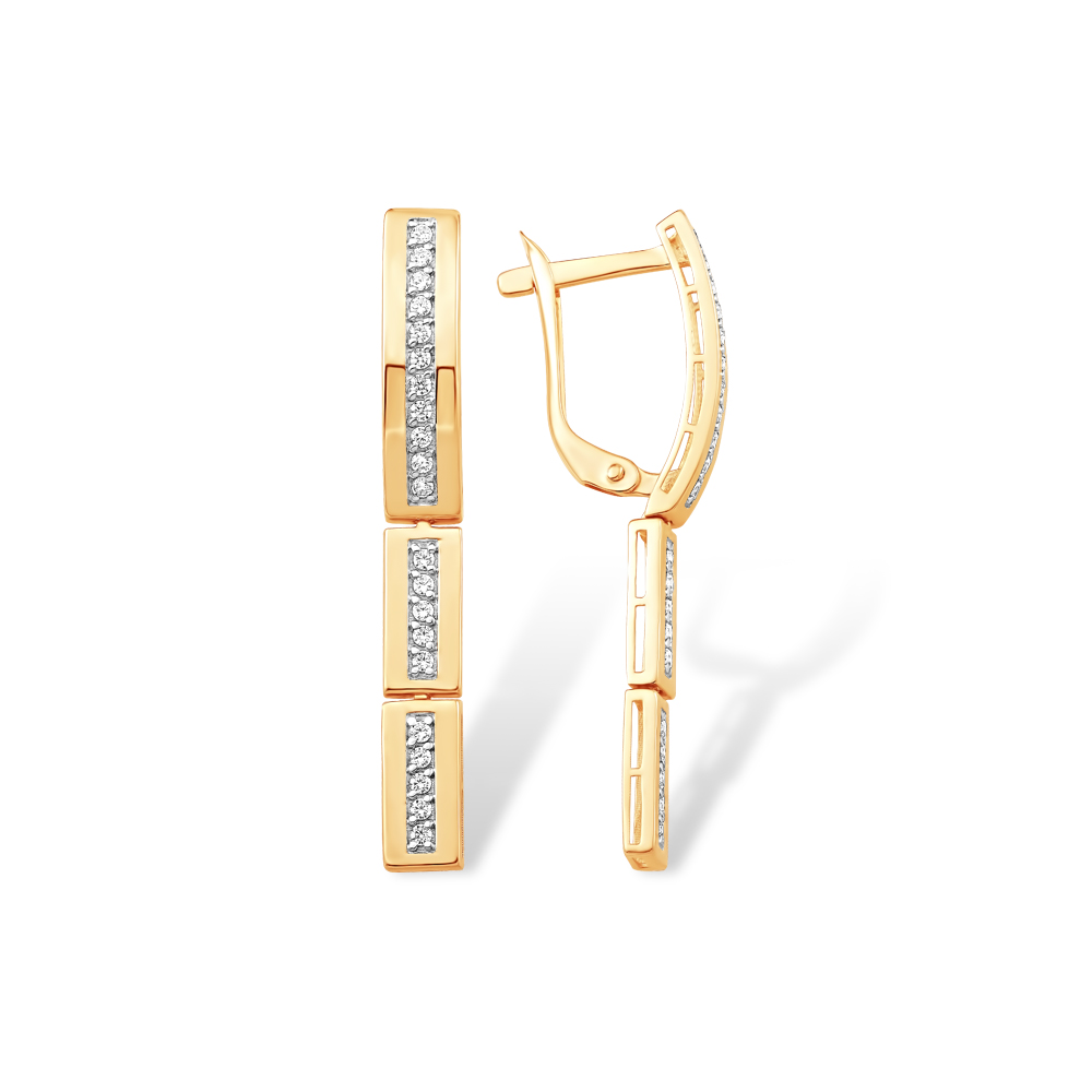 Стильные серьги из красного золота 585 пробы с подвесками дорожками из фианитов подчеркнут элегантность и женственность владелицы. Серьги великолепно смотрятся, благородный блеск золота выгодно акцентирует сияющие фианиты. Необычный дизайн привлекает внимание, и отлично впишется в современные образы. Приобретайте серьги по выгодной цене в магазинах Мир Золота.