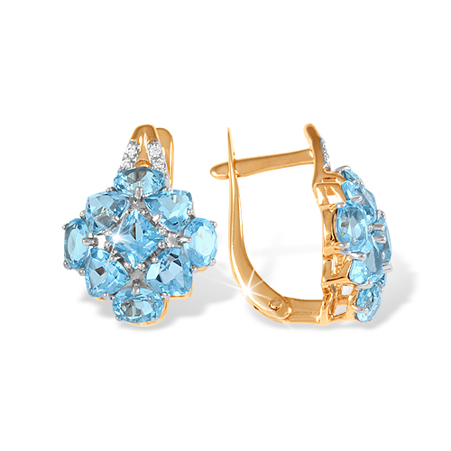 Серьги из красного золота 585 пробы с миксом голубых топазов swiss и прозрачными фианитами порадуют своим изумительным сиянием и привлекательным дизайном. Украшение с россыпью камней лазурного оттенка сделает женский образ более ярким и изысканным, и будет особенно эффектно смотреться в комплекте с кольцом. Приобретайте серьги с английским замком по выгодной цене в магазинах Мир Золота.