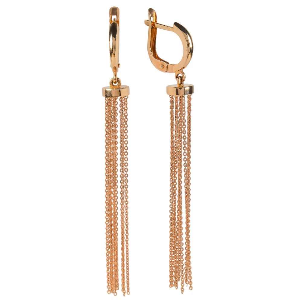 Длинные серьги из красного золота 585 пробы с подвесками в виде цепочек смотрятся стильно и элегантно, и не останутся незамеченным. Эффектное украшение будет достойным подарком для любой женщины, и великолепно украсит вечерние образы. Пополните свою коллекцию драгоценностей этим изысканным аксессуаром, или покупайте серьги в подарок по выгодной цене в магазинах Мир Золота.