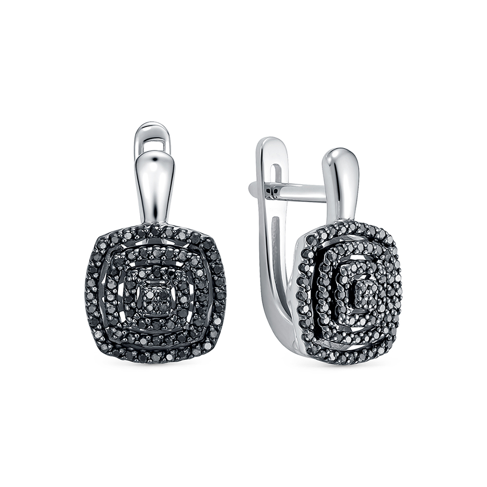Эффектные серьги из белого золота 585 пробы с россыпью черных бриллиантов подчеркнут изысканный вкус и индивидуальность владелицы. Завораживающий блеск драгоценных камней в сочетании с холодным оттенком золота приковывает взгляд, и делает украшение ярким акцентом современного образа. Тип замка - английский. Приобретайте серьги в комплекте с кольцом по выгодной цене в магазинах Мир Золота.