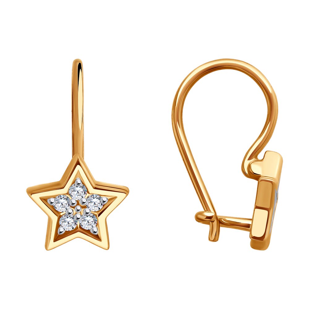 Детские серьги в виде звездочек с сияющими фианитами выполнены из красного золота 585 пробы. Легкие сережки с комфортным французским замочком и привлекательным блеском фианитов, несомненно, понравятся юным модницам и станут желанным подарком на любой праздник. Приобретайте замечательное украшение по выгодным ценам в магазинах Мир Золота.