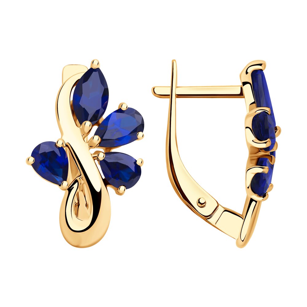 Изящные серьги с синими корундами утонченной формы огранки выполнены из красного золота 585 пробы. Привлекательные серьги с ярким блеском ювелирных камней станут идеальным подарком и очаровательной изюминкой женственного образа. Тип замка - английский, комфортен для повседневной носки. Приобретайте украшение по выгодным ценам в магазинах Мир Золота.