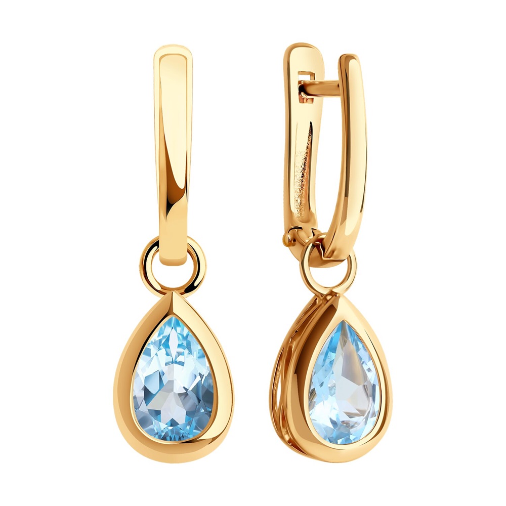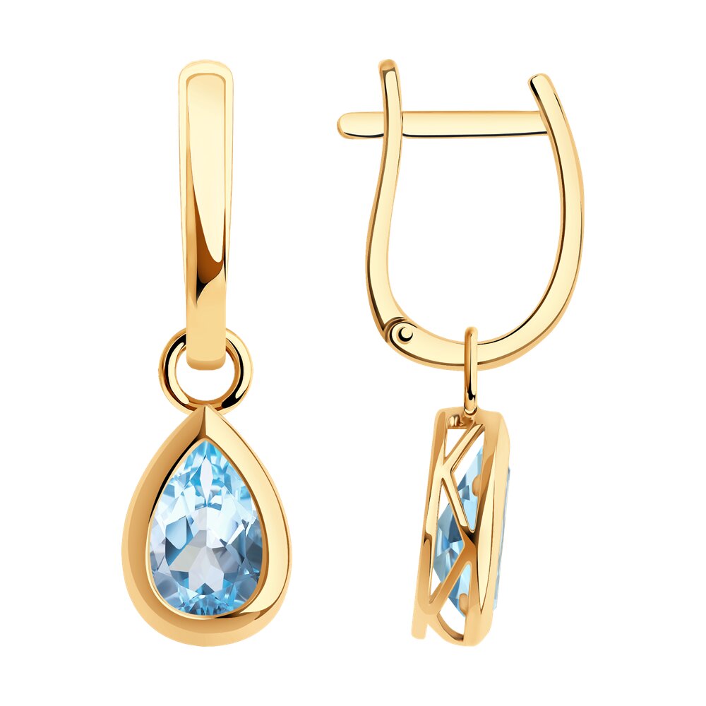 Элегантные серьги из красного золота, с подвесками с голубыми топазами, станут достойным дополнением женского образа. Крупные топазы грушевидной формы огранки притягательно смотрятся в обрамлении благородного металла, подчеркивающего их неотразимую красоту и нежный прозрачный блеск. Комфортный английский замок надежно зафиксирует украшение. Покупайте серьги выгодно в магазинах Мир Золота.