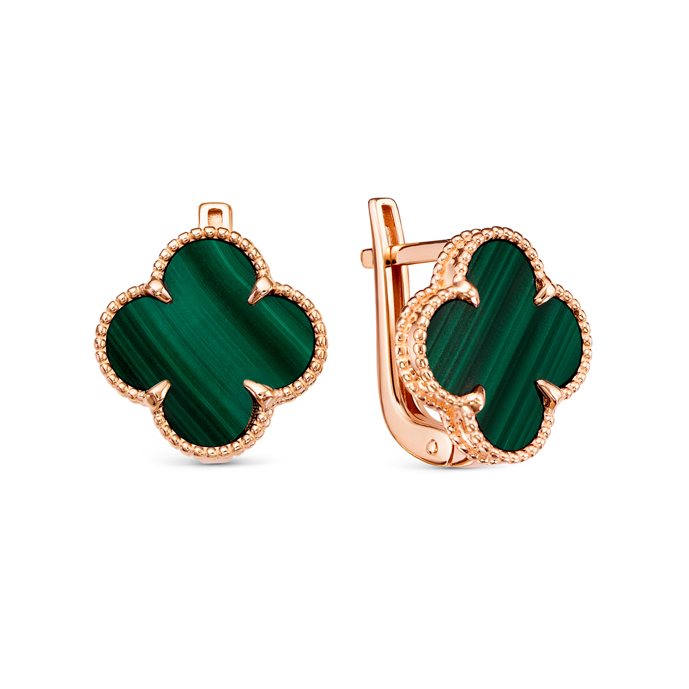 Серьги из красного золота 585 пробы в виде четырехлистного клевера олицетворяют неподвластный времени символ удачи. Это очень изысканное ювелирное украшение, которое подчеркнет чувственность - идеальный подарок мечтательной и творческой натуре. Мягкие линии золота, обрамляющие вставку из зеленого малахита, подчеркивают природную красоту и роскошь камня. Малахит символизирует процветание, богатство и гармонию.