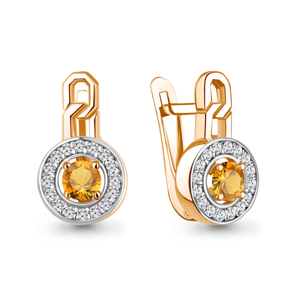 Серьги из красного золота 585 пробы декорированы яркими цитринами в окружении прозрачных фианитов. Эффектный декор из завораживающих кристальных камней теплого солнечного оттенка приковывает взгляд; украшение смотрится достойно и благородно, и станет великолепным завершающим штрихом элегантного или нарядного вечернего образа. Покупайте классические серьги для себя или в подарок выгодно в магазинах Мир Золота.