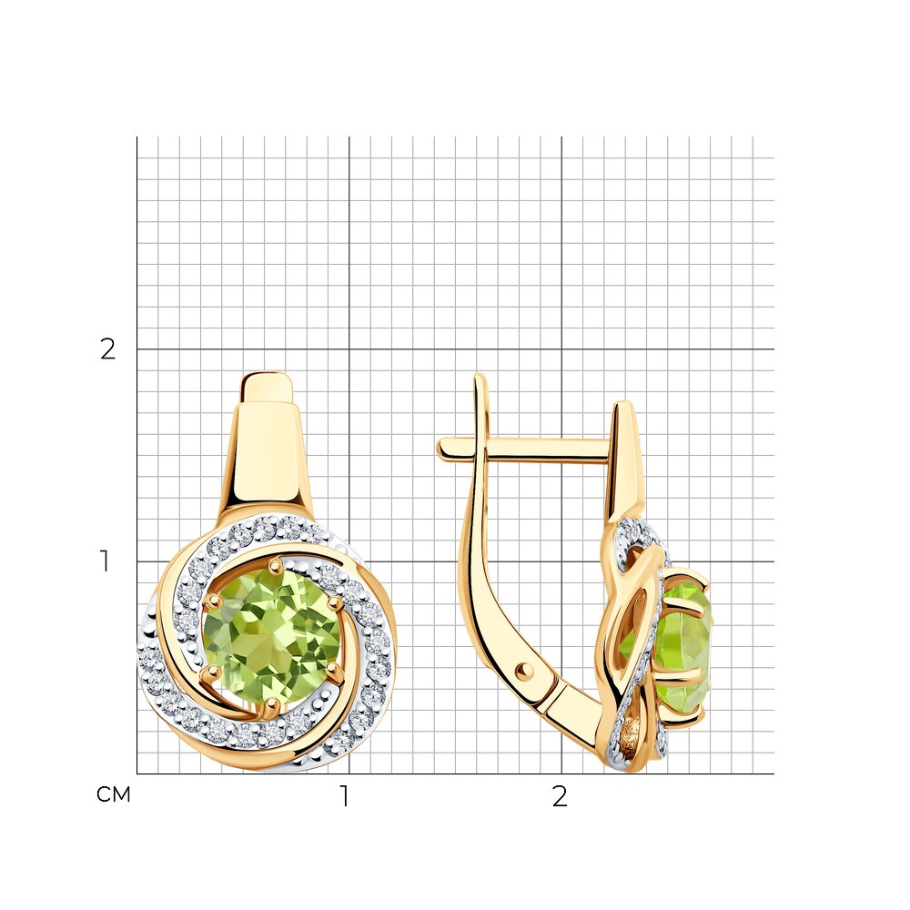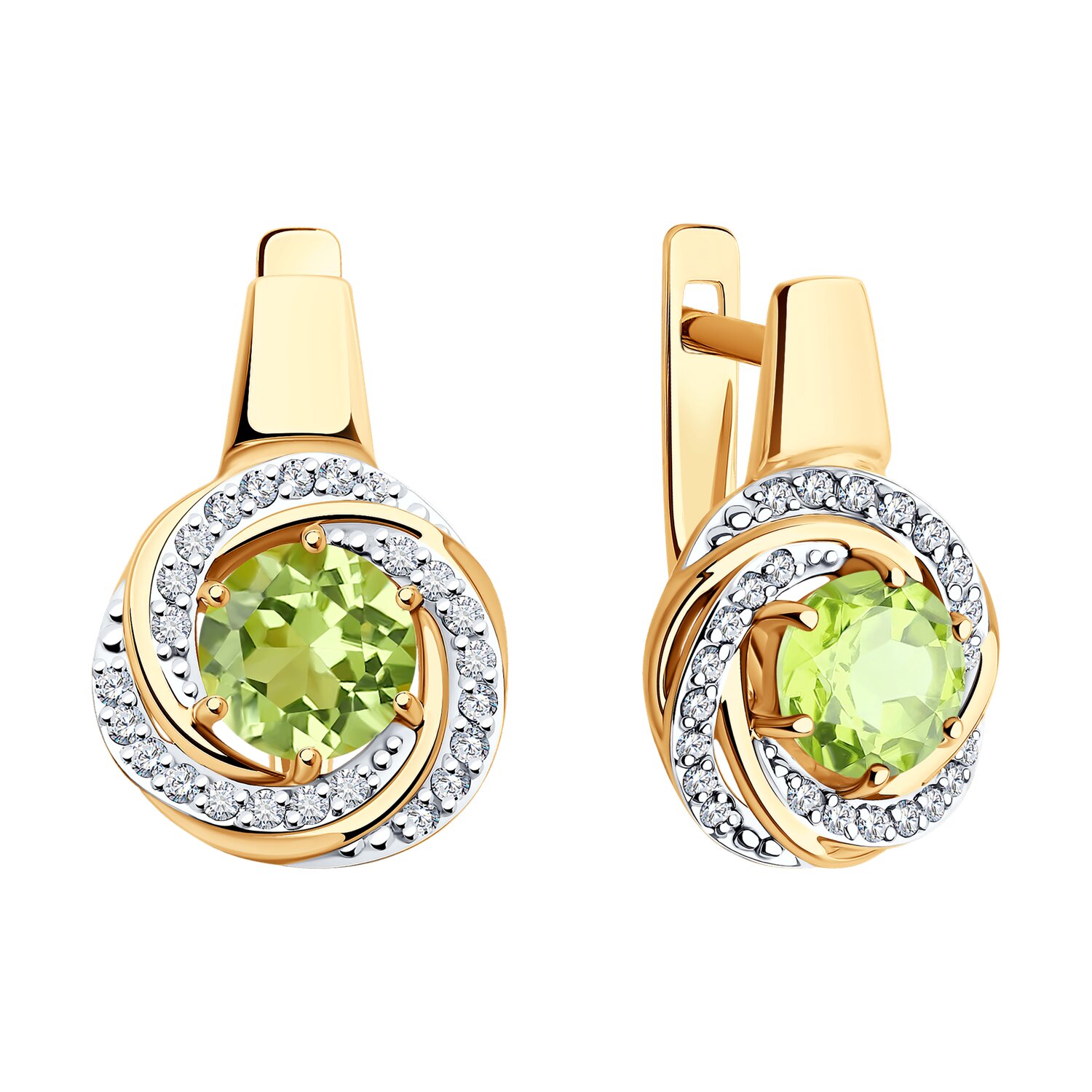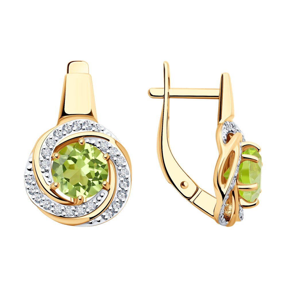 Декоративные серьги выполнены из красного золота 585 пробы с натуральным хризолитом в окружении кристальных фианитов. Удивительное сияние самоцветов зеленого оттенка подчеркнуто искристым блеском фианитов; украшение добавит женскому образу нотку изысканности и очарования. Приобретайте серьги с надежным английским замком по выгодной цене в магазинах Мир Золота.