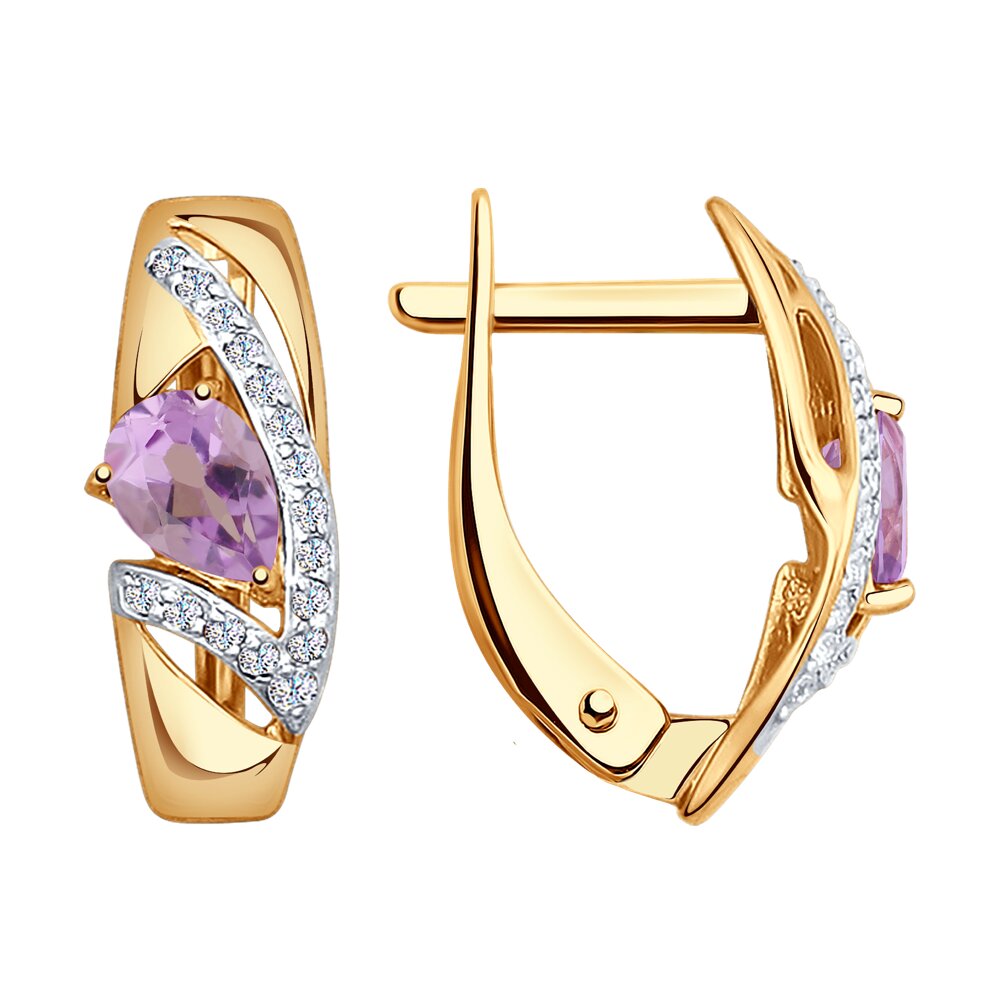 Серьги современного дизайна с натуральными аметистами грушевидной формы огранки выполнены из красного золота 585 пробы. Украшение с волшебным блеском камней фиалкового оттенка в окружении череды фианитов привлекает внимание, и станет прекрасным дополнением к любому образу. Тип замка: английский. Приобретайте ювелирное украшение с аметистами по выгодным ценам в магазинах Мир Золота.