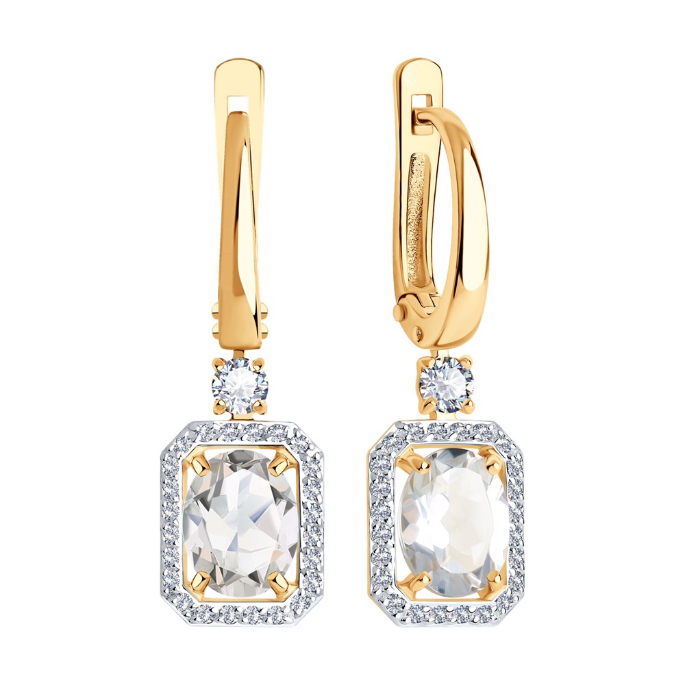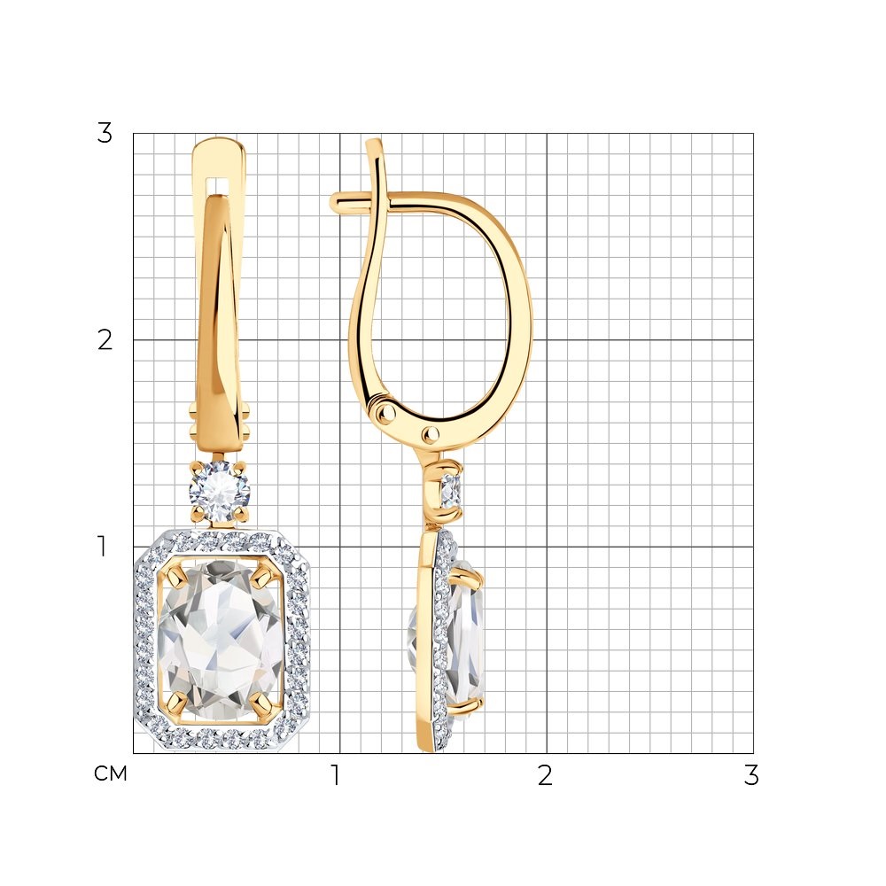 Золотые серьги с подвесками с горным хрусталём и кристальными фианитами выглядят стильно и благородно. Украшение с чистым прозрачным блеском камней станет безупречным завершением обворожительного женственного образа, и в комплекте с кольцом составит великолепный гарнитур. Тип замка - английский. Приобретайте серьги в подарок по выгодным ценам в магазинах Мир Золота.