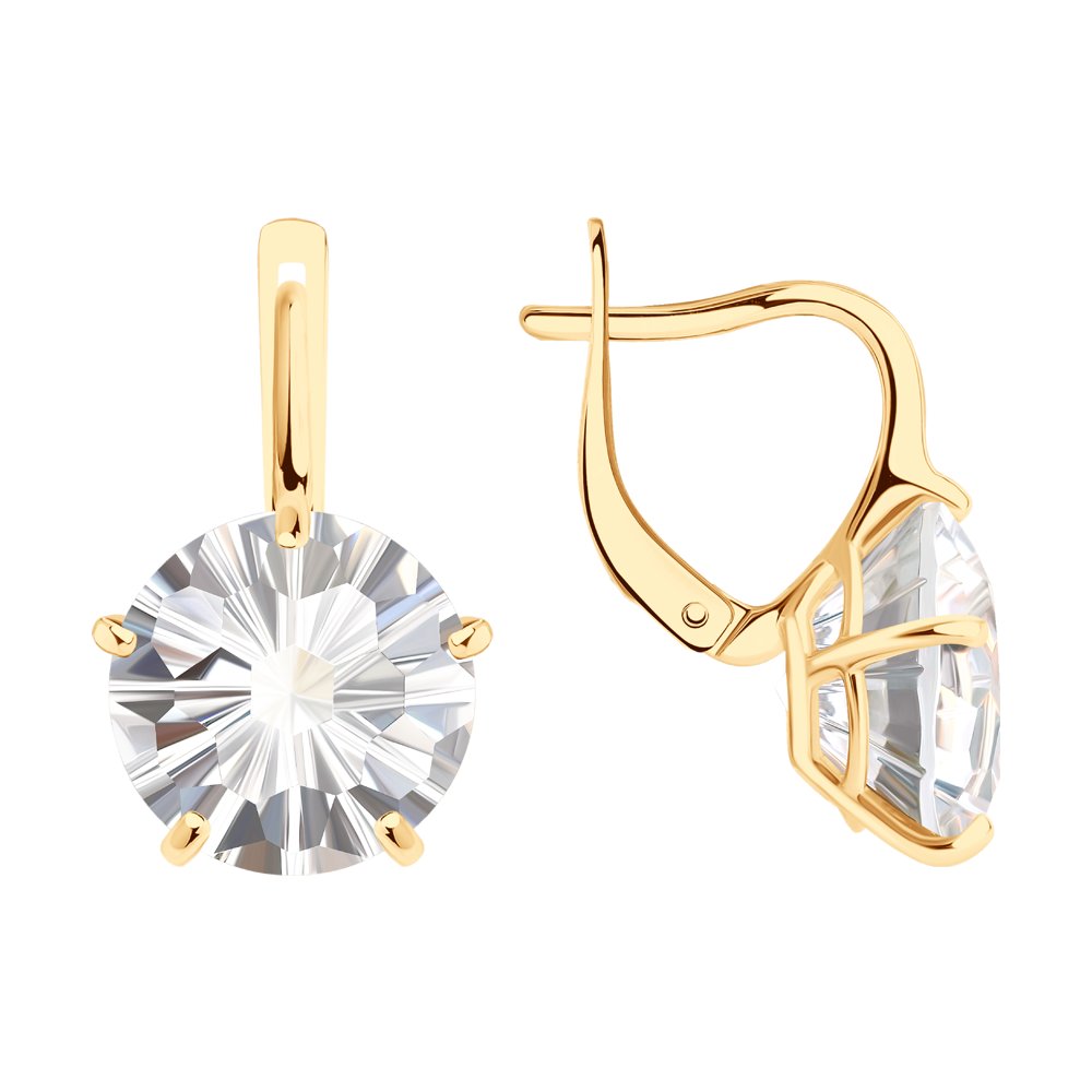 Великолепные серьги из красного золота 585 пробы с крупным камнем горного хрусталя покоряют своей красотой и сиянием. В сочетании с эффектной закрепкой прозрачный камень смотрится особенно выигрышно, красиво переливается на свету и напоминает настоящий бриллиант. Украшение добавит образу владелицы женственности и утончённости, и будет идеальным подарком. Покупайте серьги выгодно в магазинах Мир Золота.