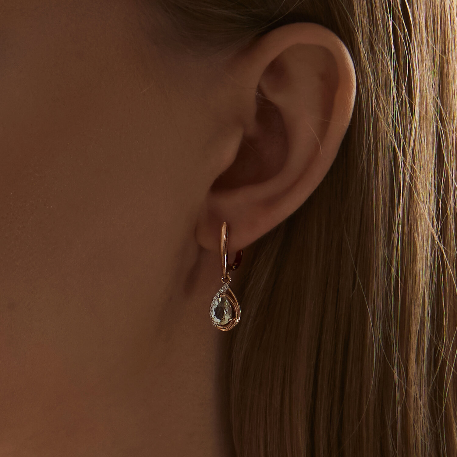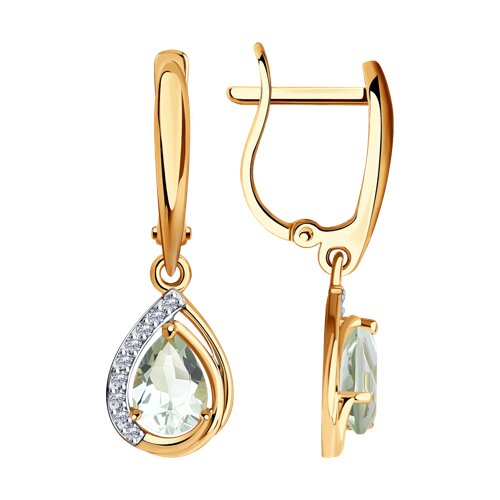 Серьги класического дизайна с подвесками с празиолитом и фианитами выполнены из красного золота 585 пробы. Интересные камни празиолита нежного зеленого оттенка выгодно подчеркнуты искристым блеском череды фианитов. Стильное украшение станет универсальным аксессуаром для повседневного или вечернего наряда. Приобретайте серьги по выгодной цене в магазинах Мир Золота.