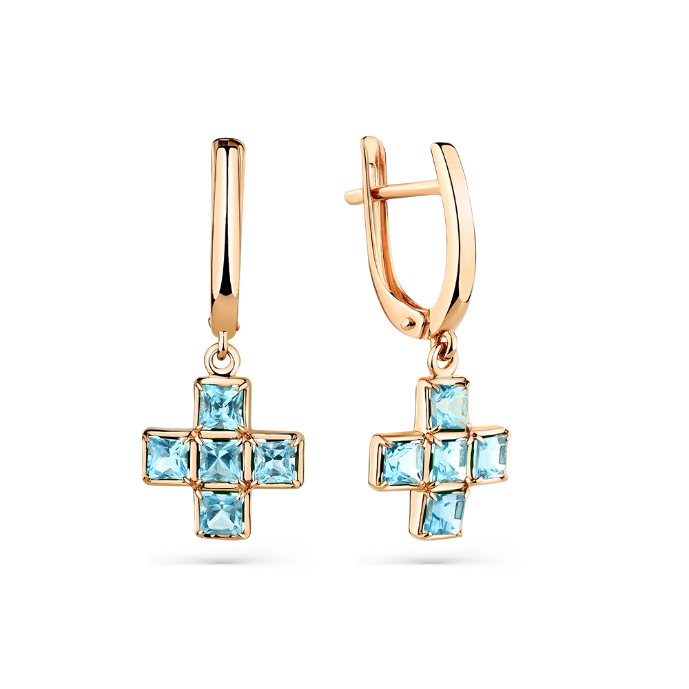 Стильные серьги с подвесками выполнены из красного золота 585 пробы с эффектным декором из натуральных голубых топазов. Яркое насыщенное сияние удивительных топазов swiss не останется незамеченным, современное украшение сделает образ женщины более изысканным и выразительным. Приобретайте актуальное украшение в подарок по выгодной цене в магазинах Мир Золота.
