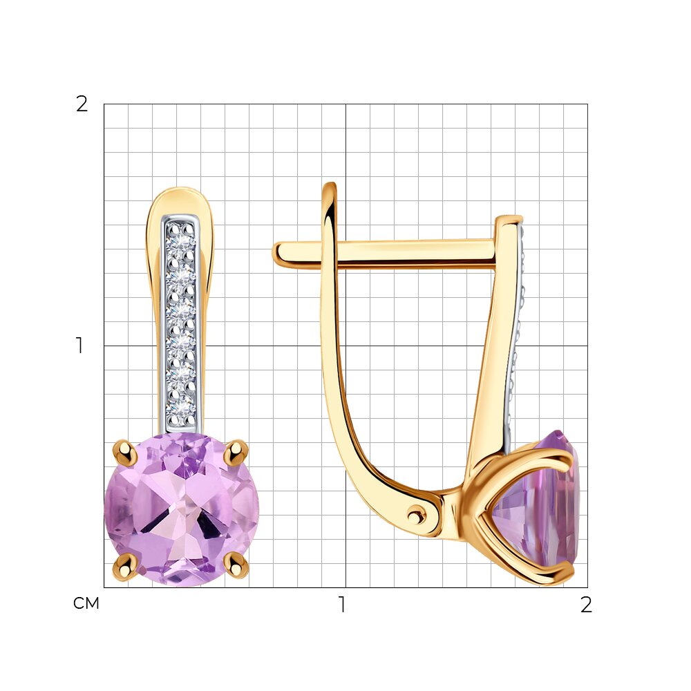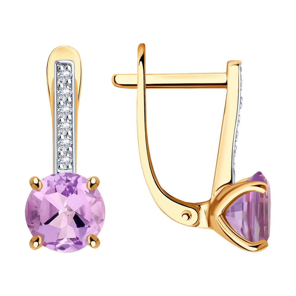 Изящные серьги из красного золота 585 пробы, украшенные натуральными аметистами и фианитами, добавят женственному образу особого очарования. Украшение с удивительным блеском камней будет прекрасным подарком, и не оставит женщину равнодушной. Серьги составят идеальное дополнение для классического и повседневного образа. Приобретайте ювелирное украшение по выгодным ценам в магазинах Мир Золота.