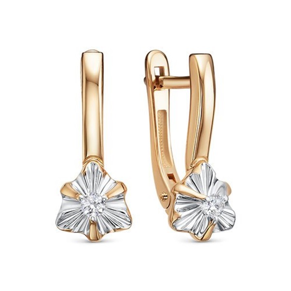 Серьги из красного золота 585 пробы декорированы изящными вставками из белого золота с сияющими бриллиантами. Очаровательное украшение станет изюминкой повседневного образа, и подчеркнет привлекательность обладательницы. Практичный и надежный английский замок комфортен в использовании. Приобретайте ювелирное украшение для себя или в подарок по выгодным ценам в магазинах Мир Золота.