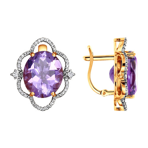 Великолепные серьги изысканного дизайна выполнены из красного золота 585 пробы с аметистами и фианитами. Превосходные аметисты приковывают внимание своим удивительным сиянием, а изящные дорожки прозрачных фианитов добавляет искристого блеска в яркий образ украшения. Приобретайте ювелирное украшение в подарок по выгодным ценам в магазинах Мир Золота.