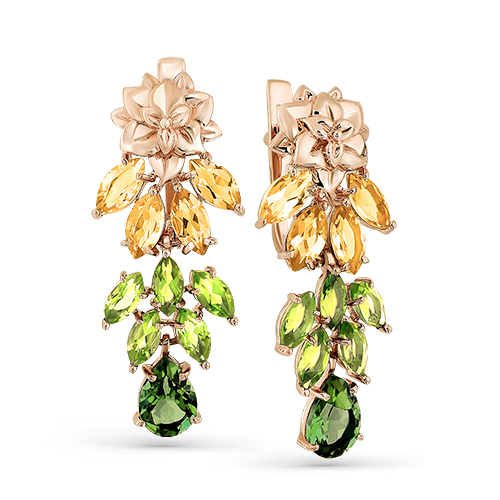 Длинные серьги с объемным декором из микса разноцветных полудрагоценных камней турмалина, хризолита и цитрина выполнены из красного золота 585 пробы в необыкновенном дизайне. Природные оттенки придают изделию лёгкость и воздушность. Оригинальное и яркое украшение обращает на себя внимание, и эффектно дополнит своими летними красками романтичный женственный образ. Приобретайте изысканное украшение выгодно в магазинах Мир Золота.