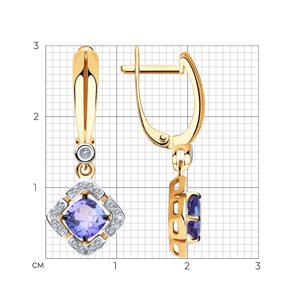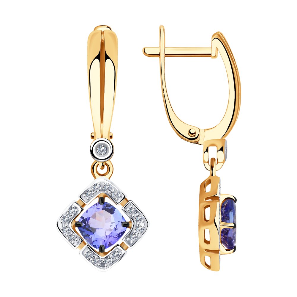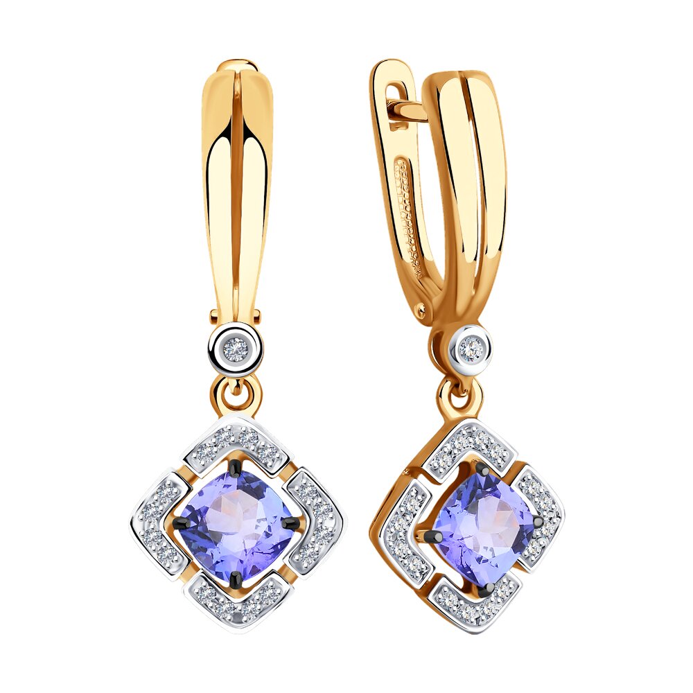 Превосходные серьги с оригинальным декором, из красного золота 585 пробы с танзанитами и бриллиантами. Превосходный танзанит удивительного оттенка огранки "кушон" стильно дополнен дорожками из прозрачных бриллиантов классической огранки. Украшение с искристым эффектом драгоценных камней сделает ваш образ неповторимым и элегантным. Приобретайте серьги по выгодным ценам в магазинах Мир Золота.