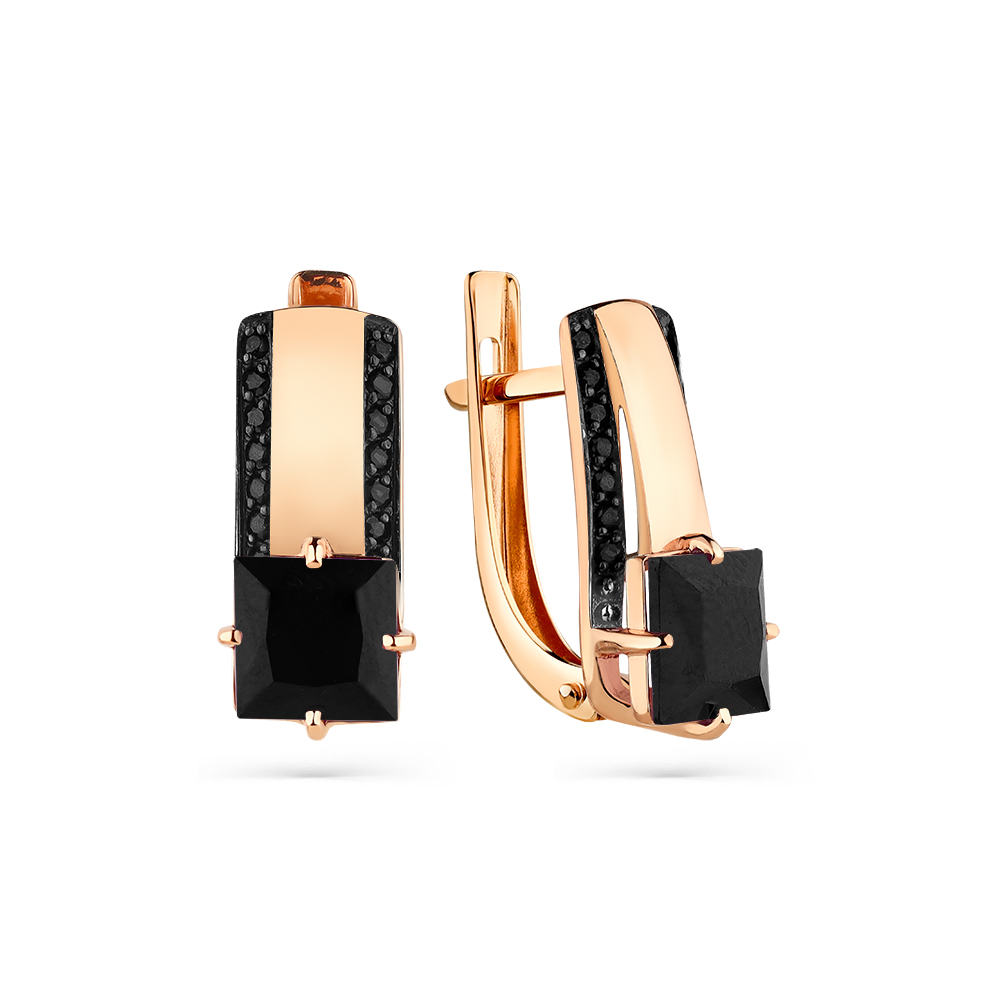 Серьги с английским замком, из красного золота 585 пробы с черной шпинелью позволят создать стильный современный образ. Яркие вставки с камнями квадратной формы огранки и выразительными дорожками обращают на себя внимание и дополнят выбранный наряд притягательным блеском и очарованием. Приобретайте универсальное украшение по выгодной цене в магазинах Мир Золота.