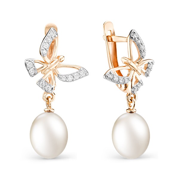Восхитительные серьги с подвесками из красного золота 585 пробы, украшенные натуральным белым жемчугом и сверкающими фианитами. Изумительный жемчуг с его мягким деликатным сиянием отлично сочетается с любыми тонами в одежде. Необыкновенный очаровательный дизайн с изящными золотыми бабочками добавит нежной легкости и романтики в образ владелицы. Приобретайте прекрасные серьги в подарок выгодно в магазинах Мир Золота.