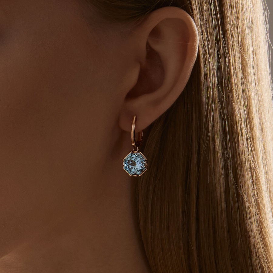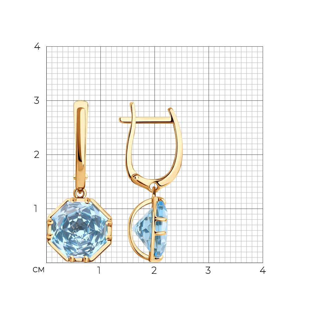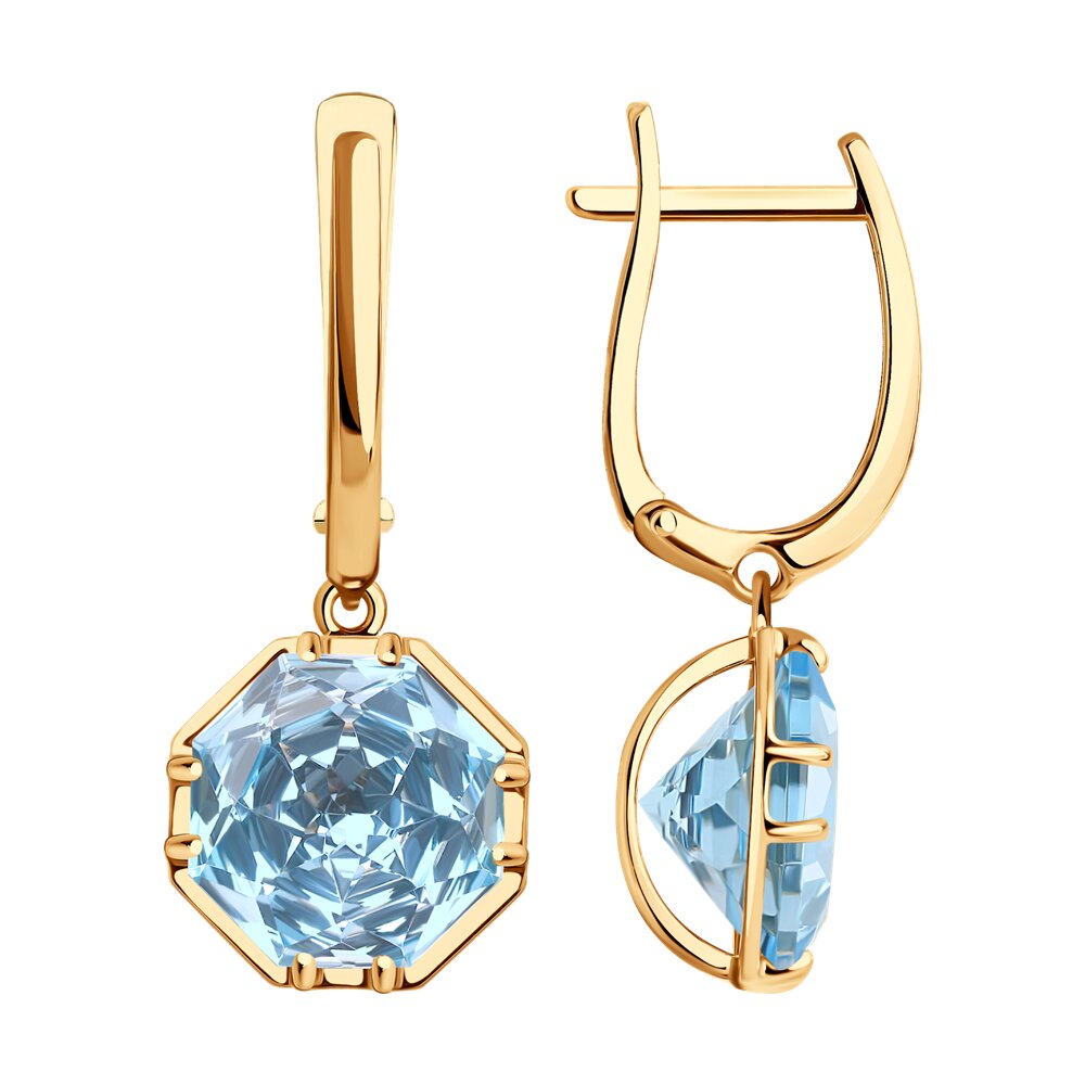 Женские серьги с необыкновенными голубыми топазами редкой формы огранки выполнены в привлекательном дизайне из красного золота 585 пробы. Эффектная оправа создает впечатление воздушности, позволяя свету проникать со всех сторон и раскрывая неповторимую красоту и изумительный блеск камней. Приобретайте нежные и женственные серьги с английским замком по выгодным ценам в магазинах Мир Золота.