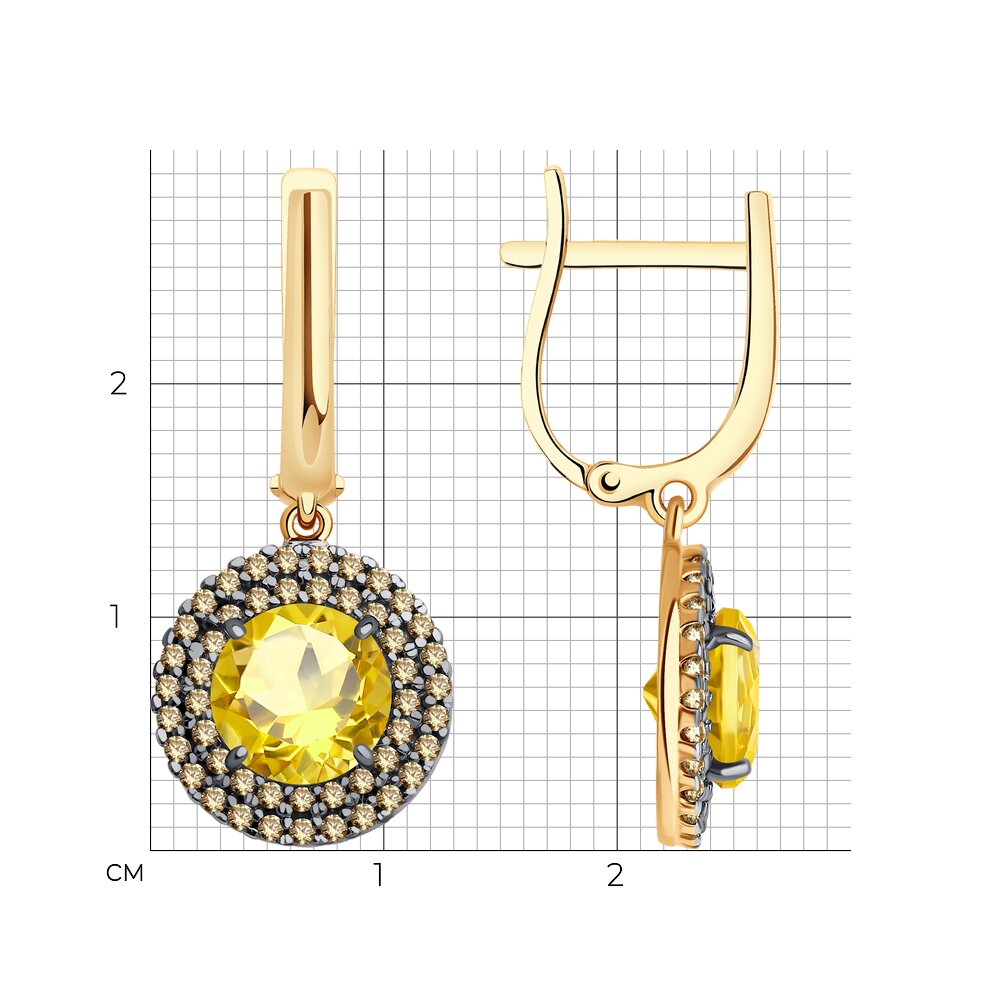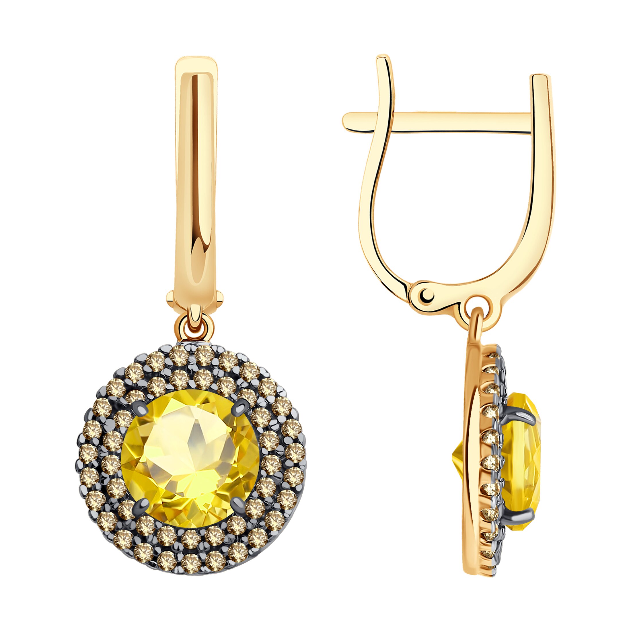Серьги с подвесками из красного золота 585 пробы декорированы яркими цитринами в окружении цветных фианитов. Эффектный декор из завораживающих кристальных камней теплого солнечного оттенка приковывает взгляд, украшение смотрится достойно и благородно, и станет великолепным завершающим штрихом элегантного или нарядного вечернего образа. Покупайте серьги для себя или в подарок выгодно в магазинах Мир Золота.