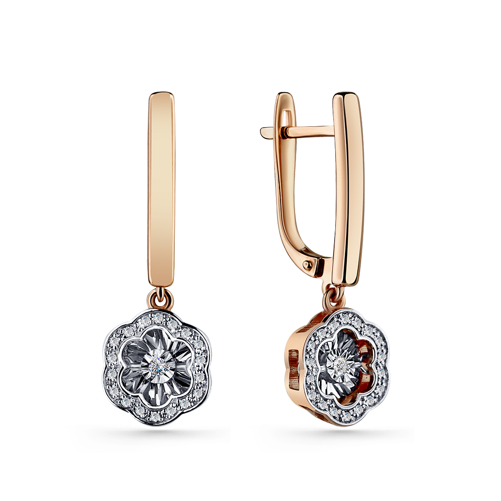 Серьги с подвесками из красного золота 585 пробы с драгоценными бриллиантами изысканно подчеркнут женскую красоту и очарование. Украшение с завораживающим блеском «танцующих» бриллиантов и алмазной гранью сделает образ владелицы более ярким и привлекательным, и будет великолепным подарком на любой праздник. Приобретайте серьги с бриллиантами по выгодным ценам в магазинах Мир Золота.
