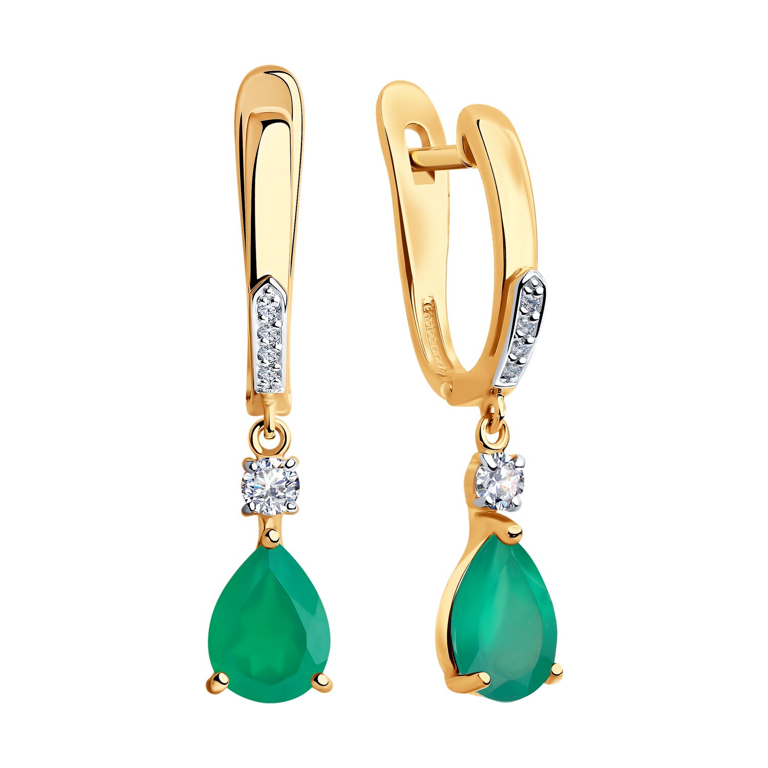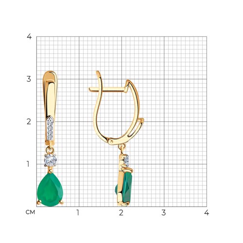 Серьги с английским замком выполнены из красного золота 585 пробы с крупными зелеными агатами и вставками с прозрачными фианитами. Великолепные агаты грушевидной формы огранки приковывают взгляд, закрепка камней раскрывает их нежное переливчатое сияние и неотразимую красоту. Приобретайте украшение для создания эффектного женственного образа выгодно в магазинах Мир Золота.