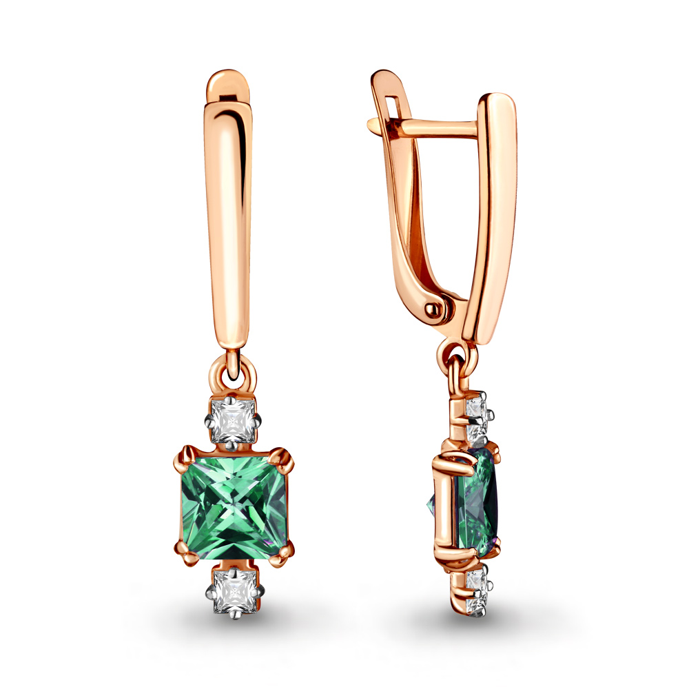 Серьги с подвесками с зеленой шпинелью и сияющими фианитами выполнены из красного золота 585 пробы. Украшение привлекательного дизайна великолепно смотрится, и идеально дополнит нежный женственный, подчеркнув безупречный вкус обладательницы. Приобретайте серьги с комфортным английским замком для себя или в подарок по выгодным ценам в магазинах Мир Золота.