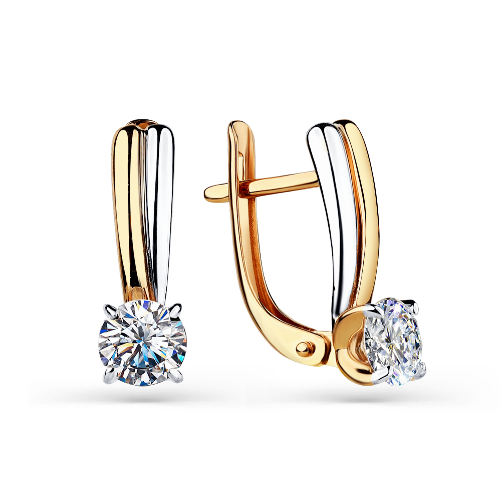 Серьги классического ювелирного дизайна с сияющими фианитами выполнены из красного и белого золота 585 пробы. Серьги с искристым блеском камней привлекательно смотрятся, и станут изящным дополнением женственного образа. Тип замка - английский. Приобретайте ювелирное украшение для себя или в подарок по выгодной цене в магазинах Мир Золота.