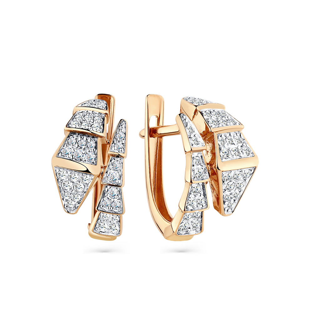 Стильные серьги из красного золота 585 пробы с россыпью сияющих фианитов выполнены в актуальном ювелирном дизайне. Оригинальное украшение станет выразительным акцентом современного образа, и подчеркнет изысканный вкус и чувство стиля владелицы. Приобретайте серьги с английским замком по выгодной цене в магазинах Мир Золота.