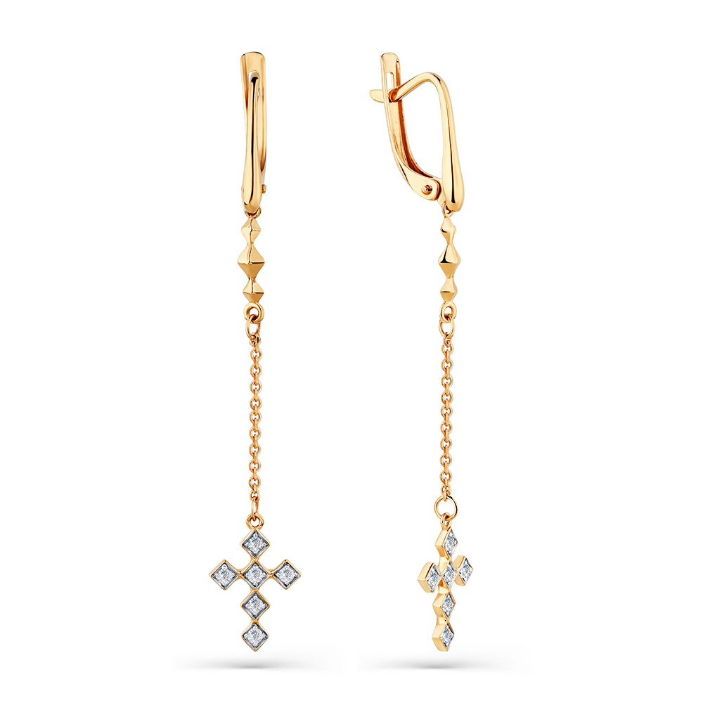 Длинные серьги с подвесными элементами в виде крестов с кристальным блеском фианитов выполнены из красного золота 585 пробы. Оригинальные серьги эффектно смотрятся, и подчеркнут индивидуальный стиль обладательницы. Тип замка - английский. Приобретайте ювелирное украшение по выгодным ценам в магазинах Мир Золота.