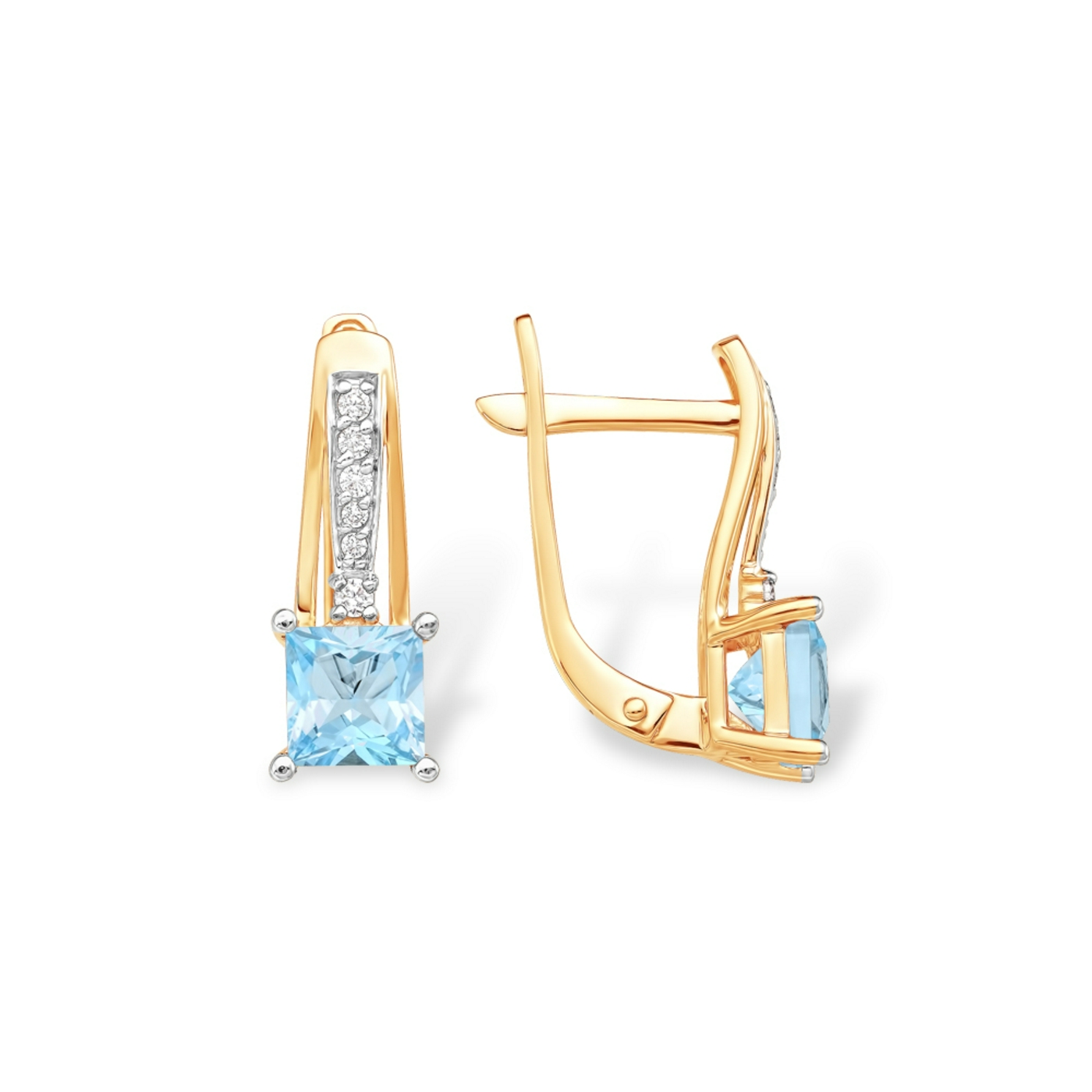 Чувственые серьги из красного золота 585 пробы украшены голубым топазом и чередой прозрачных фианитов. Полудрагоценный топаз обладает насыщенным оттенком и блеском и покоряет своей природной красотой. Украшения с топазом придадут женскому образу утонченности, и сделают его элегантным и загадочным. Приобретайте серьги по выгодной цене в магазинах Мир Золота.