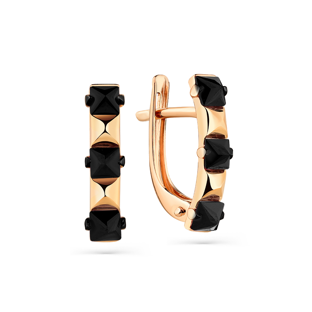 Серьги современного дизайна, декорированные вставками с черной синтетической шпинелью квадратной формы огранки, выполнены из красного золота 585 пробы. Стильное украшение отлично впишется в повседневные луки, и поможет создать завершенный образ. Приобретайте серьги с комфортным и надежным английским замком по выгодной цене в магазинах Мир Золота.
