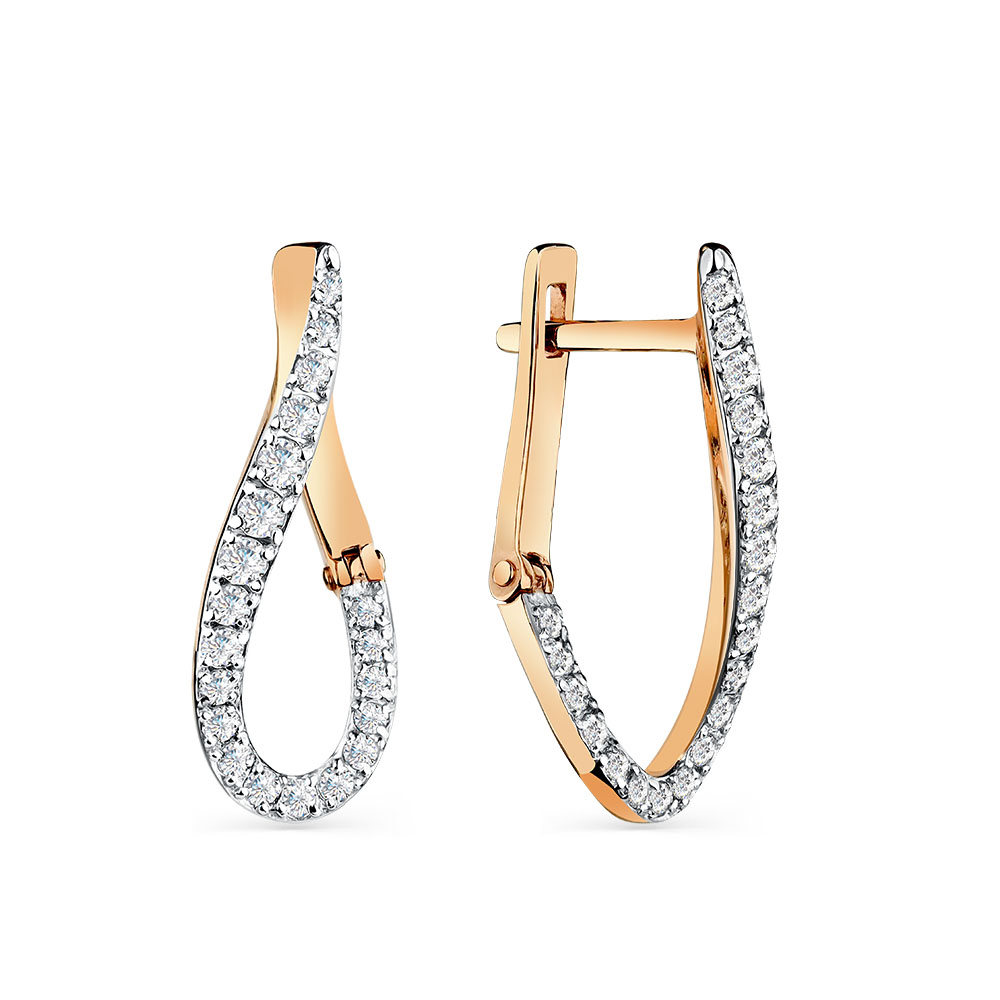 Привлекательные серьги современного ювелирного дизайна с дорожками сияющих фианитов выполнены из красного золота 585 пробы. Украшение с мерцающим блеском кристальных камней изящно смотрится, и подчеркнет женственность и очарование обладательницы. Приобретайте серьги с комфортным и надежным английским замком по выгодным ценам в магазинах Мир Золота.