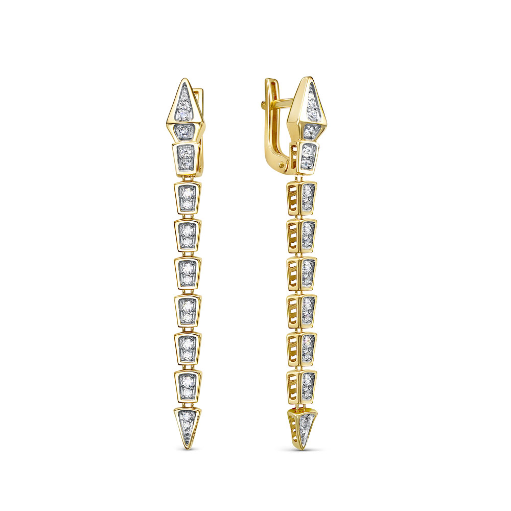 Эффектные длинные серьги выполнены из теплого желтого золота в форме змеи, декорированные множеством блестящих фианитов, отражающих свет при каждом вашем движении. В таком украшении вы будете в центре внимания на любом празднике. Удобный и надежный элегантный английский замок. Приобретайте ювелирные серьги выгодно в магазинах Мир Золота.