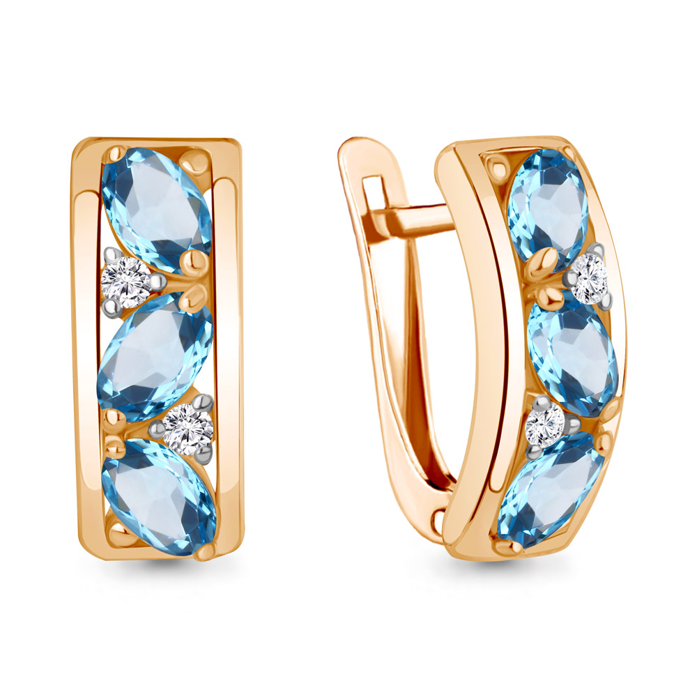 Изысканные серьги с голубыми топазами swiss и прозрачными фианитами выполнены из красного золота 585 пробы. Изумительный блеск лазурных камней, разбавленных капельками кристальных фианитов, очаровывает с первого взгляда. Серьги смотрятся стильно и достойно, и станут незаменимым аксессуаром для безупречного женственного образа. Дополните свою коллекцию этим ярким приобретением, покупайте серьги выгодно в магазинах Мир Золота.