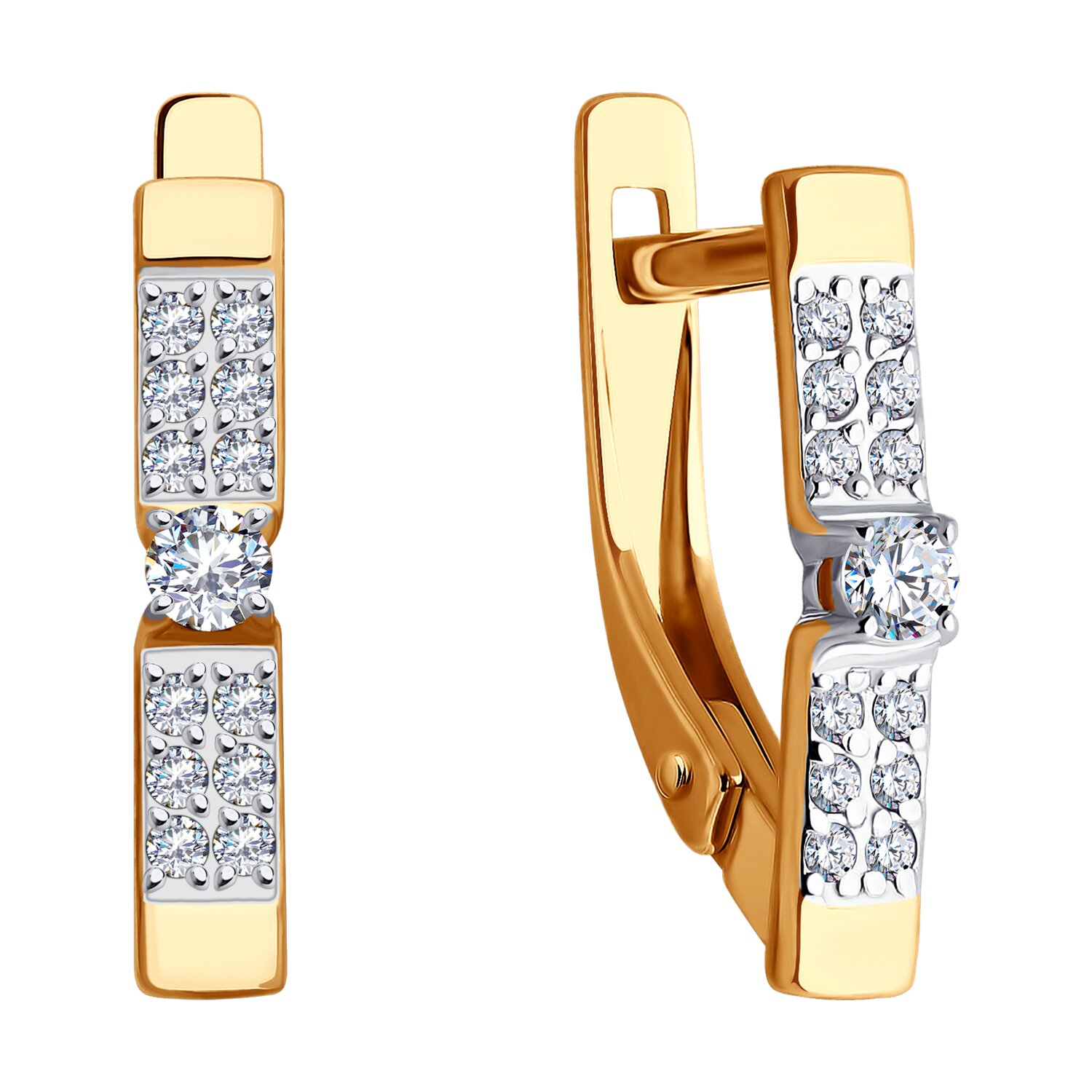 Классические серьги из красного золота 585 пробы с паве сверкающих фианитов станут идеальным украшением на каждый день. Акцентное золото подчеркивает игру света 26 камней круглой огранки. Английский вид замка. В центре внимания бренда SOKOLOV– совершенство его произведений и принципы высочайшего качества.