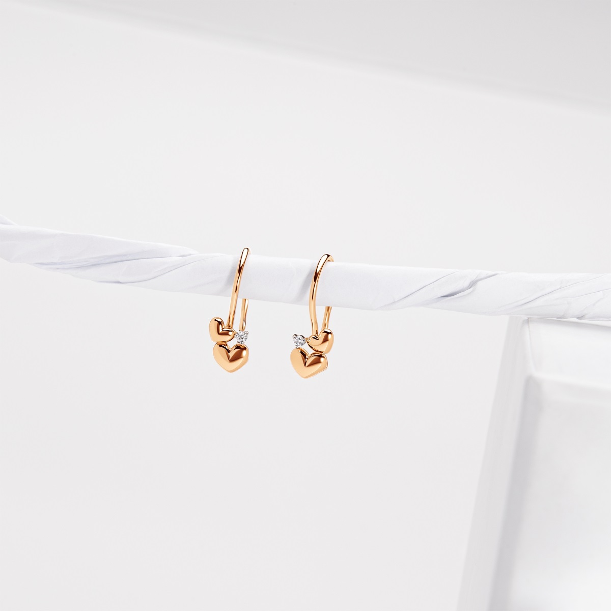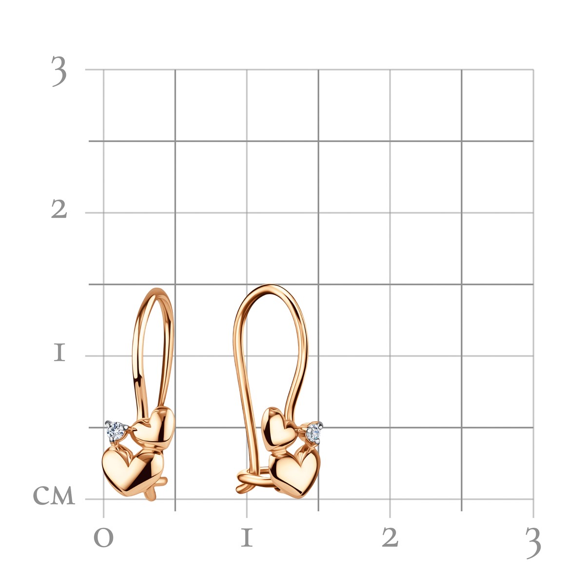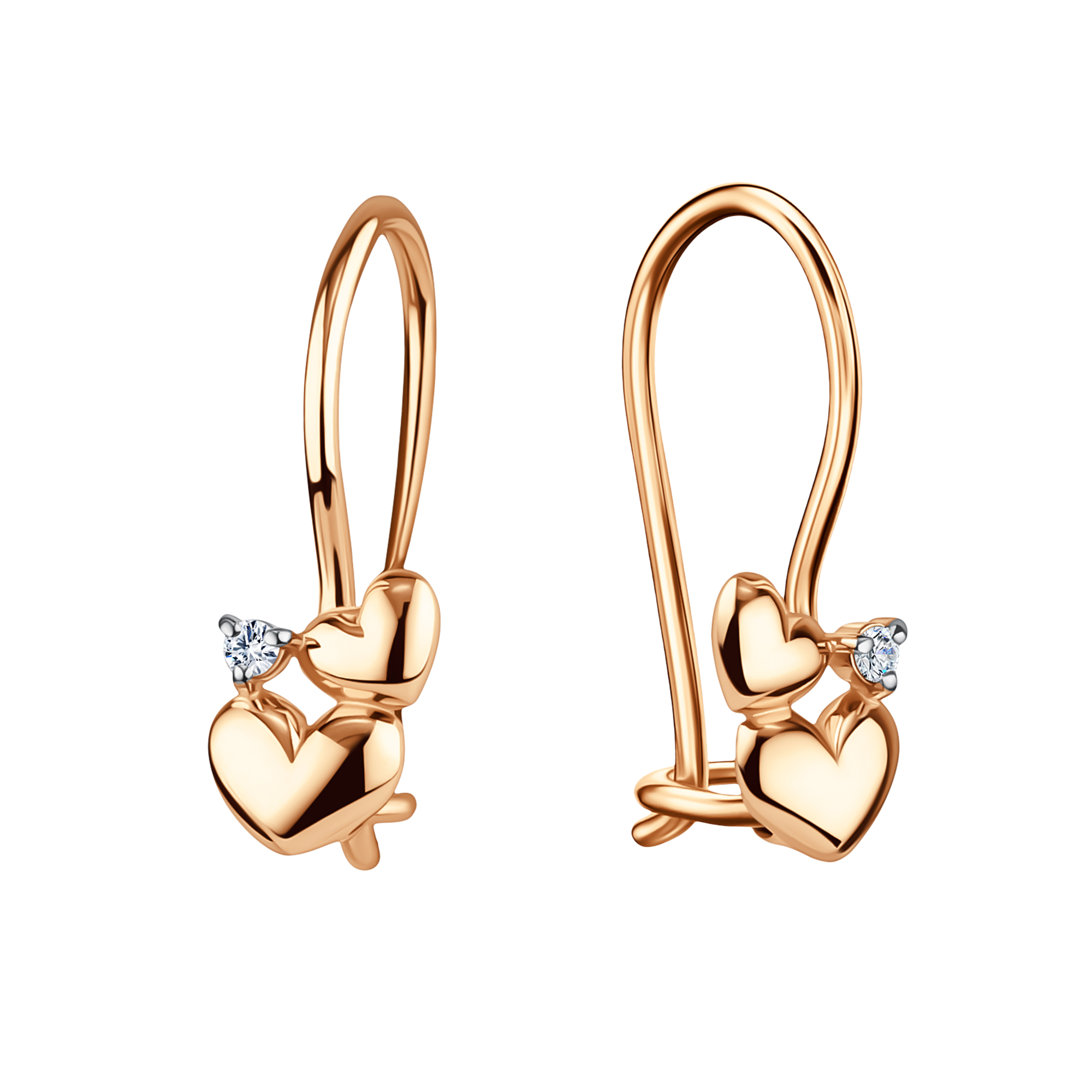 Нежные детские серьги из красного золота в форме маленьких сердец с солирующим фианитом – очаровательный и стильный аксессуар для девочки. Классический французский замок обеспечивает надежную фиксацию серьги в ухе. Аккуратные серьги придутся по вкусу маленьким модницам и станут любимым повседневным украшением. Если вы ищете подарок для маленькой принцессы, такие серьги станут отличным выбором!