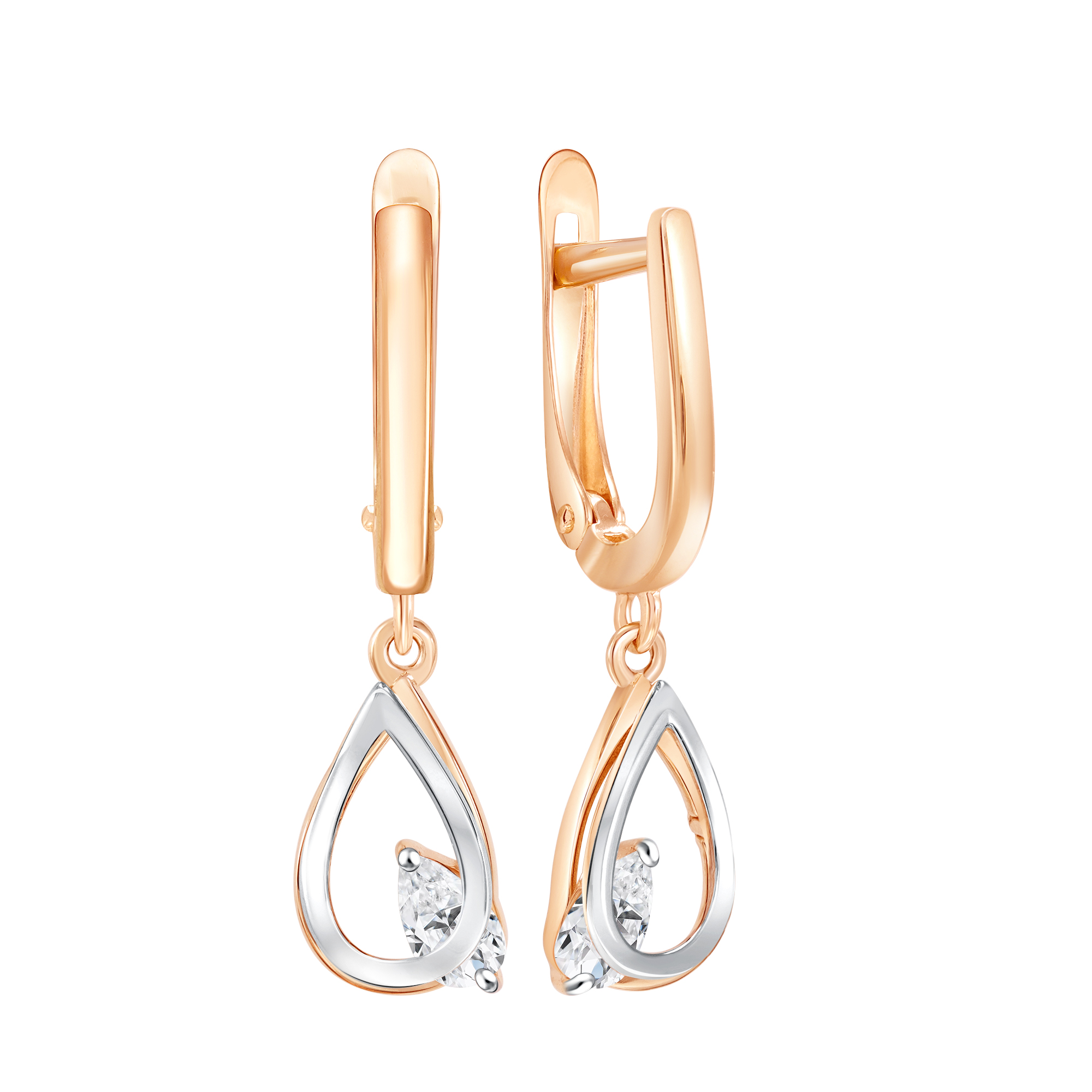 Изящные серьги из красного золота с фианитами дополнены изящными подвесками, которые придают аксессуару легкость и динамику. Идеально подойдут для создания как повседневных, так и вечерних образов.