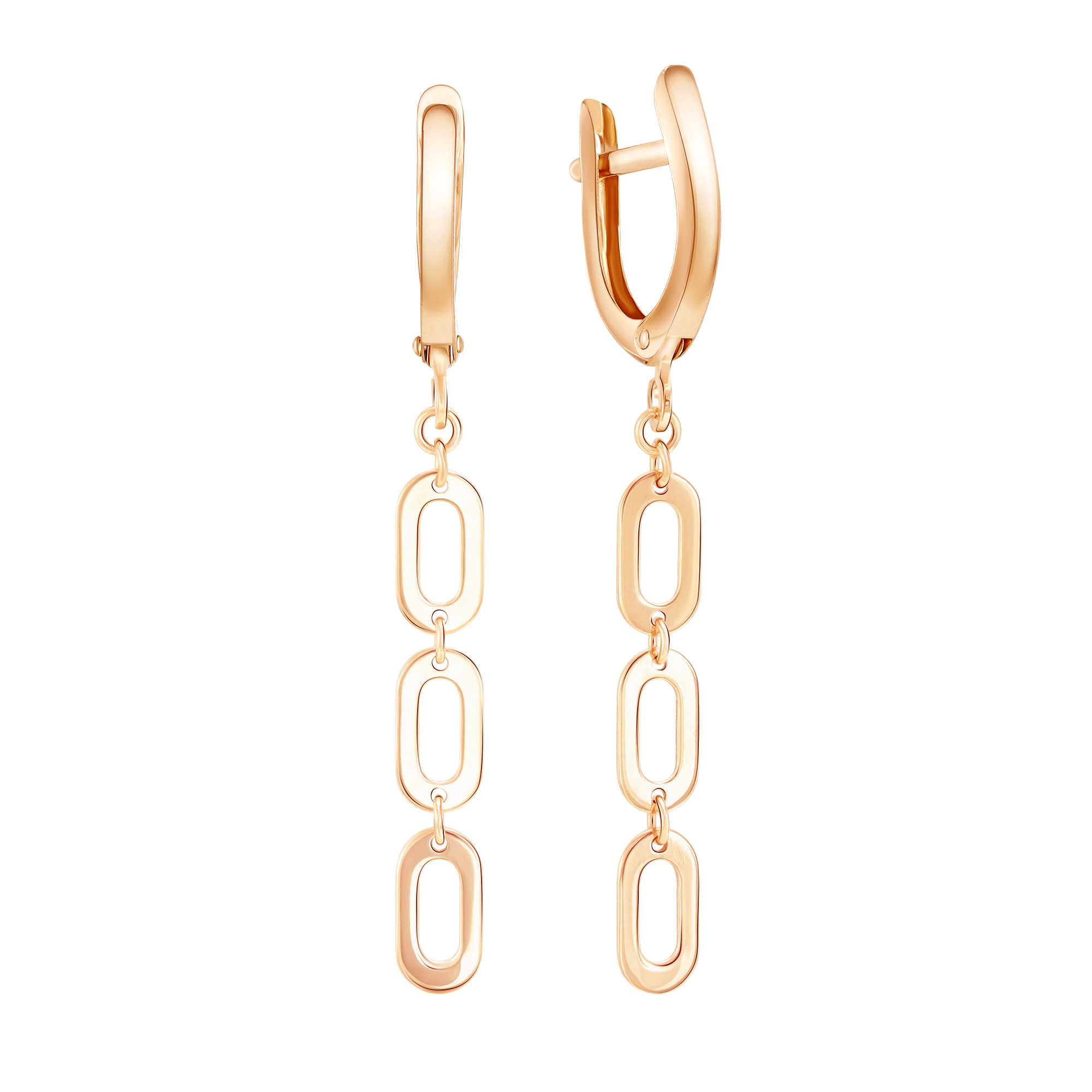 Элегантные серьги из красного золота привлекают внимание своими крупными звеньями, создающими эффект объемности и легкости. Подвески выполнены в форме звеньев, которые мягко покачиваются при движении, играя светом и отражая тепло золотого металла. Лаконичный дизайн подчеркивает натуральность цвета золота. Такие серьги станут незаменимым элементом стиля, идеально дополняя любые наряды и подходящие как для дневных выходов, так и для особых случаев.