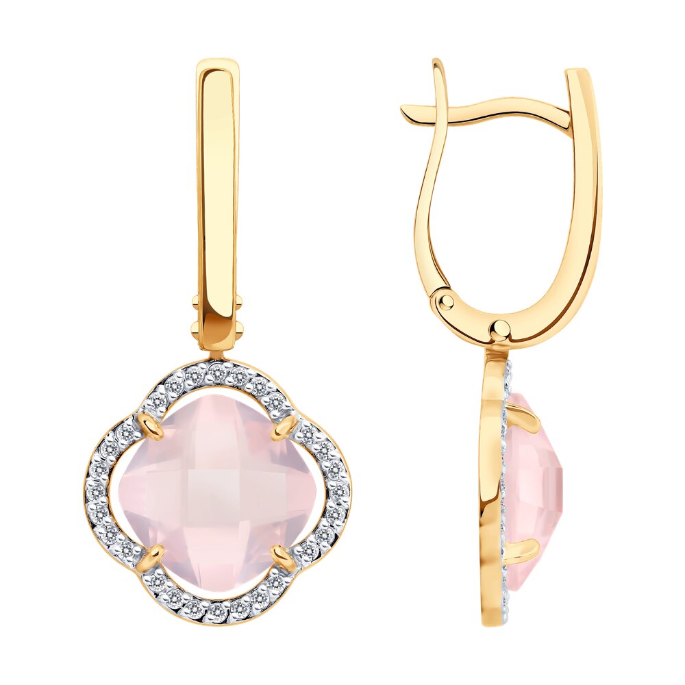 Серьги из красного золота 585 пробы притягивают внимание своим аристократичным видом и насыщенным цветом металла. Природные кварцы в центральной части изделия играют переливающимися оттенками, придавая серьгам особый шарм. Фианиты усиливают игру света, создавая эффект многогранности и объемности. Эти серьги станут идеальным дополнением вечернего образа.