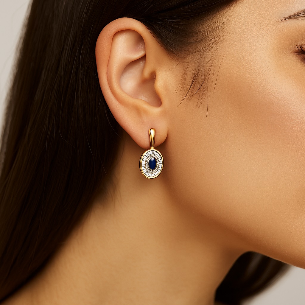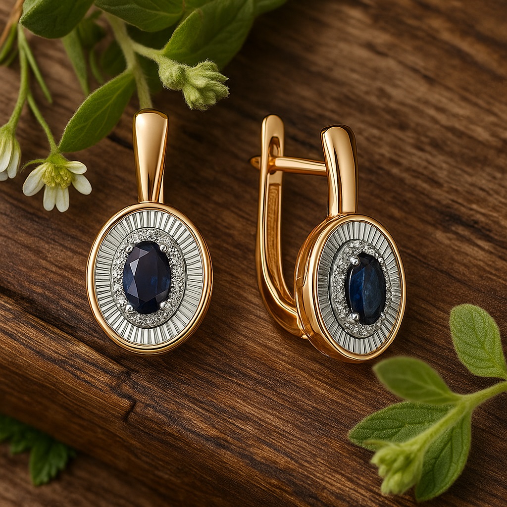 Эффектные серьги выполнены из красного золота высшей пробы, которое придает изделию благородный теплый оттенок. Центральное место занимают овальные сапфиры насыщенного синего цвета, символизирующие мудрость и спокойствие. Их дополняют сверкающие бриллианты идеальной огранки, подчеркивающие изысканность дизайна и привлекающие внимание игрой света. Элегантная форма и гармоничное сочетание драгоценных камней делает эти серьги отличным выбором для торжественных мероприятий и повседневных образов.