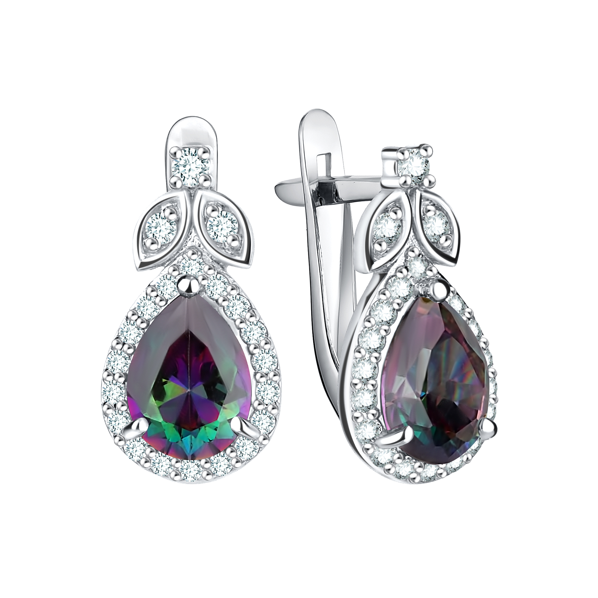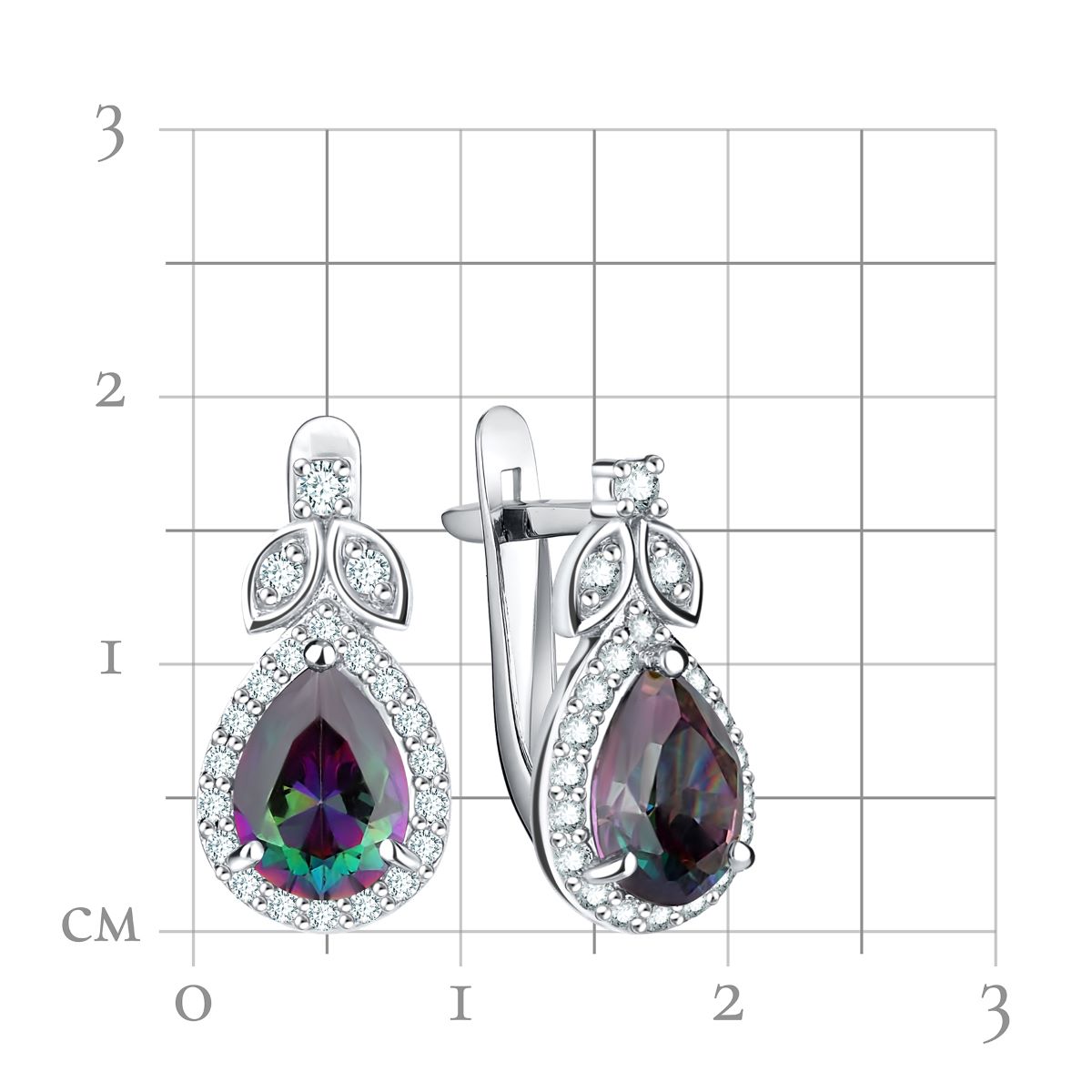 Серьги серебряные женские с кварцем и фианитами, английский замок. Вставка: кварц мистик огранки груша 8х6 мм (оттенок зеленый), фианиты бесцветные огранки круг 1.25 мм, 1.75 мм, 1.5 мм. Ювелирные серьги - идеальный подарок любимой девушке. Аксессуар подойдет для повседневного образа, романтичного свидания и торжественного мероприятия. Кварц-мистик обладает уникальными переливами, разноцветным блеском и эффектом ирризации (оптический эффект радужного сияния). Благодаря переходам цветов от фиолетового до зеленого серьги будут притягивать восхищенные взгляды.